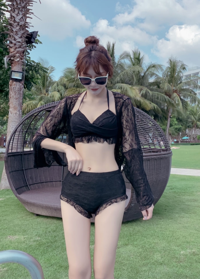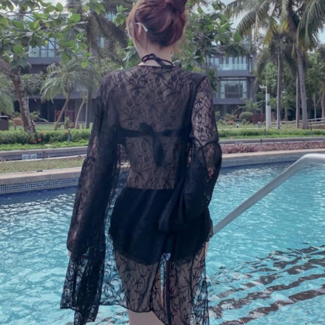 水着 ビキニ スイムウェア 紐ビキニ 体系カバー水着 羽織り セパレート パッド付き 紐 体系カバー 二の腕カバー レース シフォン フリル ハイウエスト 透け感 シースルー 胸元 谷間 谷間魅せ 盛れる メッシュ セット 上下セット 3点セット スリーピース かわいい 大人可愛い