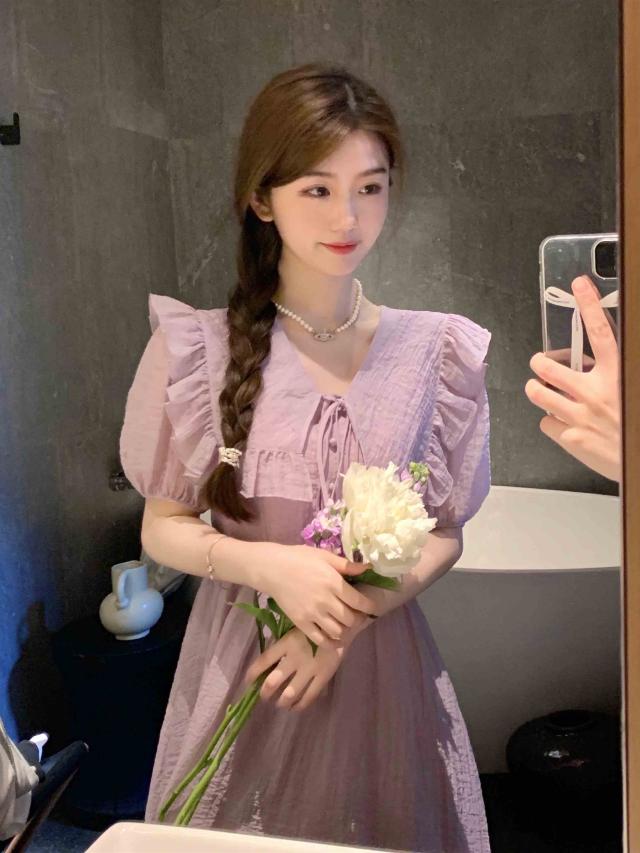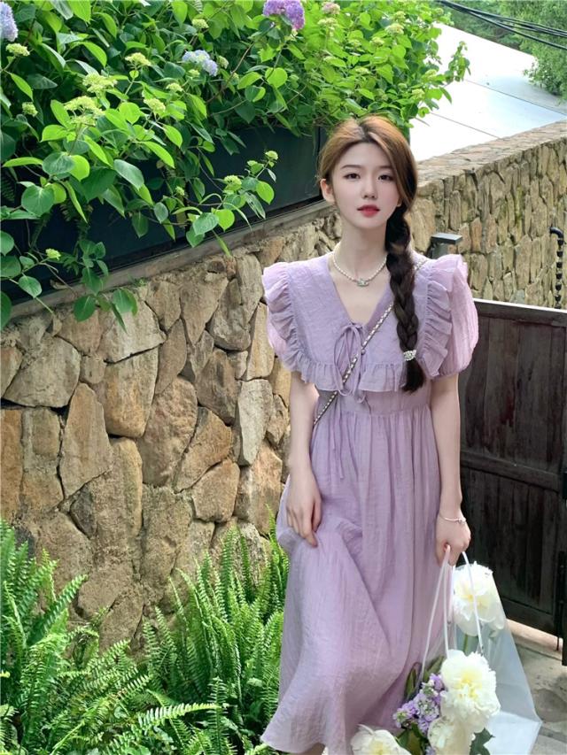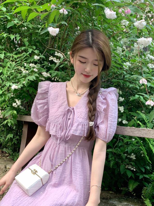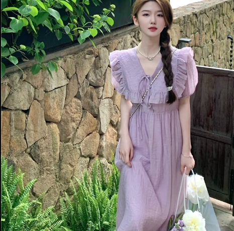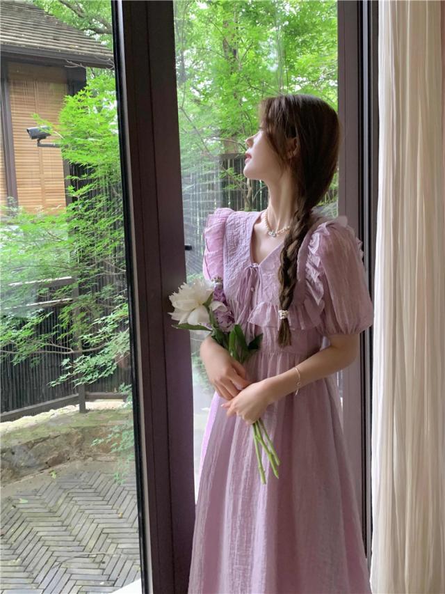 パフスリーブワンピース ドレス スカート ワンピース ドレス ロングスカート ロング ロング丈 五分袖 パフスリーブ フリル Vネック Aライン ハイウエスト ウエストマーク 大人可愛い きれいめ シンプル 大人 上品 おしゃれ お洒落 かっこいい レトロ 大人女子 キュート 個性的 セクシー モダン 無地 春 夏 20代 30代 レディース 女性用 デート お出かけ 女子会 休日 パーティー イベント リゾート ホテル ガーデン レストラン 普段使い コーデ スタイル S M L ラベンダー パープル