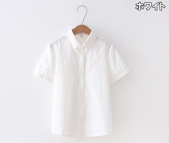 シャツ レディース トップス ブラウス S M L XL ホワイト 白 ブルーグレー 灰色 青 無地 ライン コットン 綿 春 夏 半袖 襟付き ショート丈 ミドル丈 ストレート スリム フィット 細身 ママ フェミニン ナチュラル カジュアル きれいめ きれカジ 大人 大人可愛い こなれ感