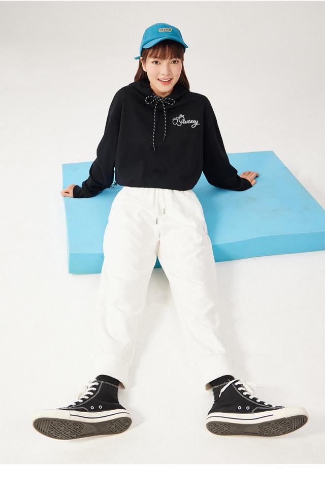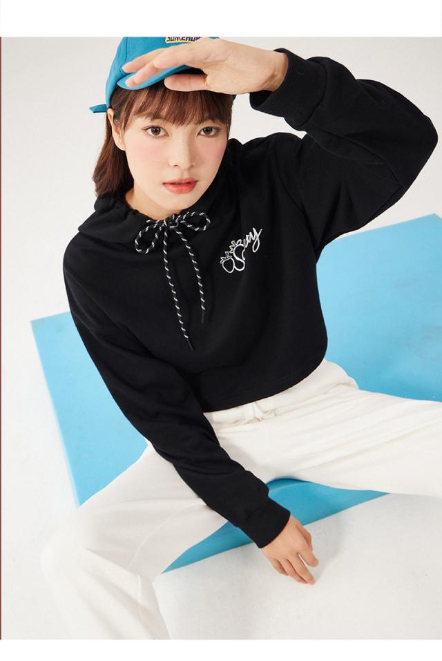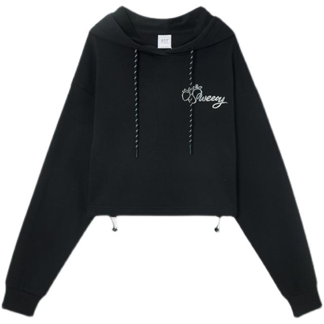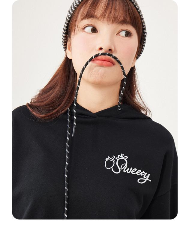 トップス レディース トレーナー パーカー スウェット フーディー ショート丈 袖あり 長袖 ドロップショルダー ロゴ イチゴ ストロベリー ドロストデザイン リボン フード付き かわいい シンプル カジュアル おしゃれ お洒落 かっこいい こなれ感 ラフ メンズライク ボーイッシュ スポーティー 抜け感 S M L 黒 ブラック 無地 春 秋 冬 10代 20代 30代 40代 ママ 学生 通学 休日 公園デビュー 運動 ジム ヨガ アウトドア イベント 旅行 楽ちん 普段使い 韓国 オルチャン