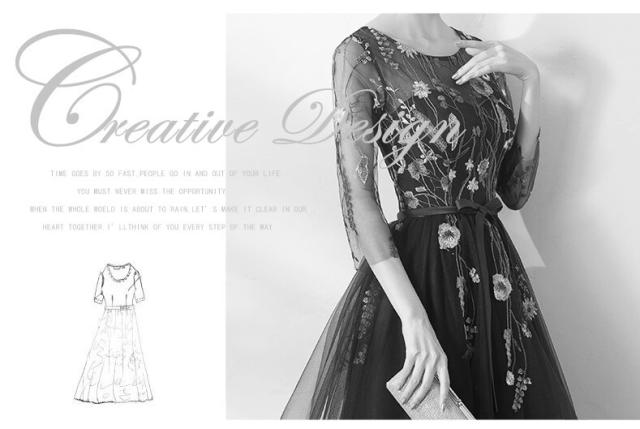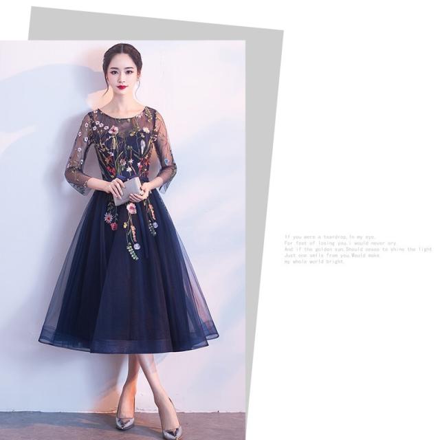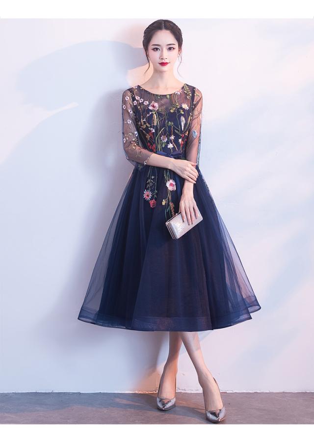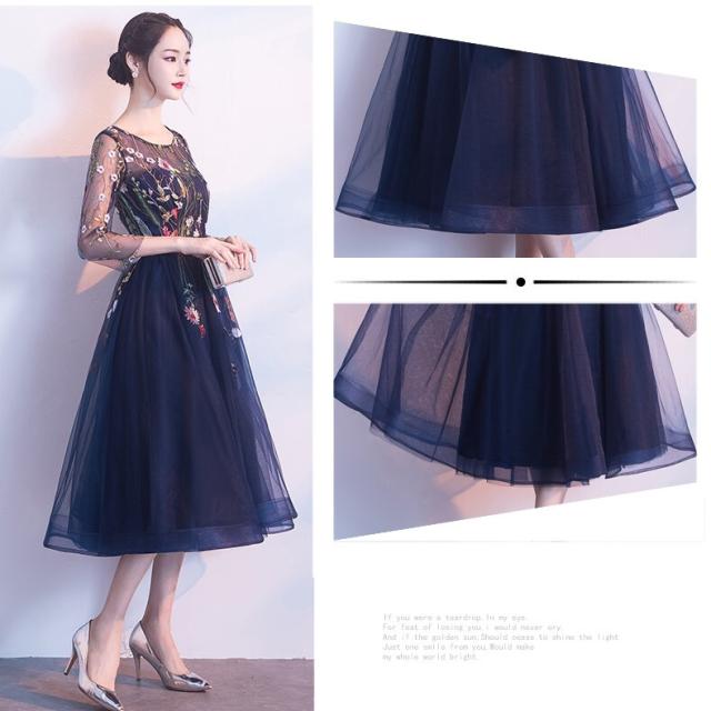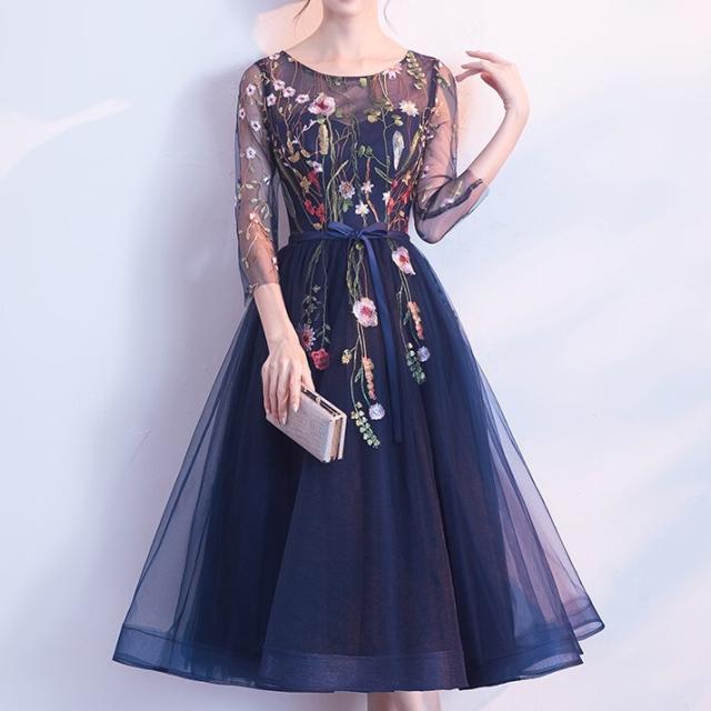 ドレス 衣装 パーティードレス 結婚式ドレス 二次会ドレス カラードレス ミモレ丈ドレス Aラインドレス ワンピースドレス ミモレ 袖あり 7分袖 七分袖 ラウンドネック 襟なし フレア チュール シフォン リボン ウエストマーク ウエストリボン ファスナー 大人可愛い 上品 キュート エレガント フォーマル 華やか お嬢様 清楚 花柄 フラワー レディース 女性用 パーティー イベント ホテル レストラン 美脚 お呼ばれ S M L XL 2XL 青 ブルー ネイビー 大人カラー