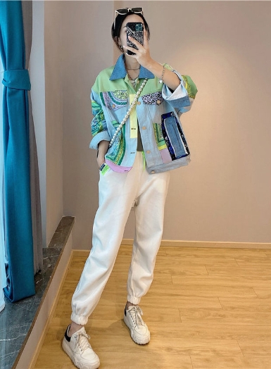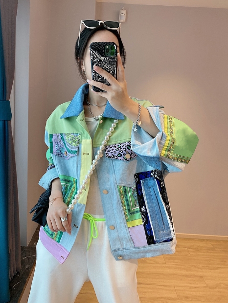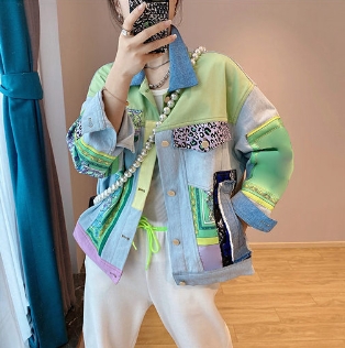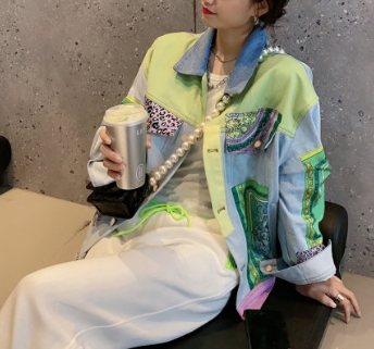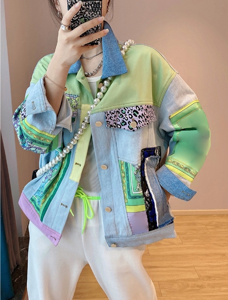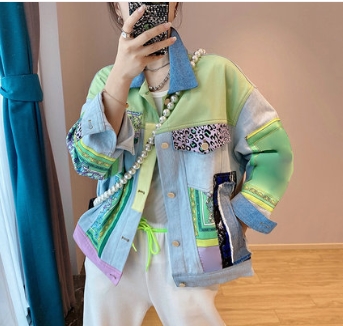レトロ風 トップス アウター ジャケット デニムジャケット ミドル丈 袖あり 長袖 ボリューム袖 ワイド 襟付き ポロカラー ポケット 前開き ステッチ ブルーデニム カジュアル レトロ ラフ マニッシュ スポーティー ルーズ 個性的 存在感 ニッチ ストリート ヒョウ柄 レオパード 春 秋 10代 20代 レディース 女の子 学生 お出かけ 公園デビュー 休日 イベント 旅行 普段使い 韓国系 ファッション 体系カバー インスタ映え サイズ S M L XL 大きめ ブルーグリーン