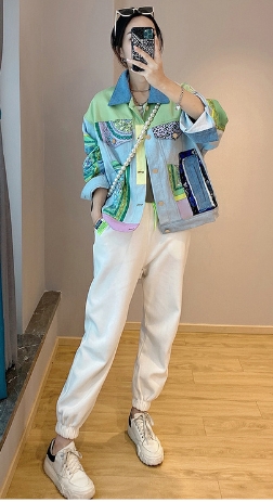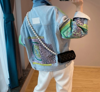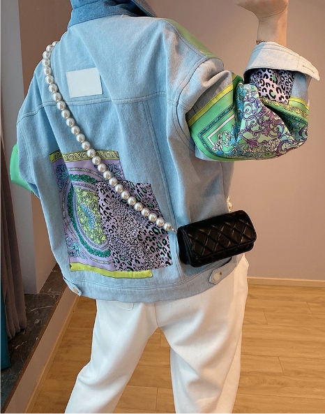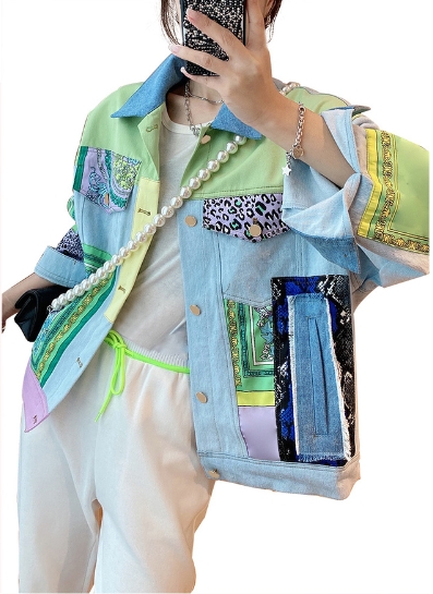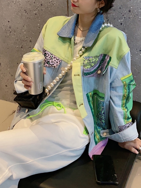 レトロ風 トップス アウター ジャケット デニムジャケット ミドル丈 袖あり 長袖 ボリューム袖 ワイド 襟付き ポロカラー ポケット 前開き ステッチ ブルーデニム カジュアル レトロ ラフ マニッシュ スポーティー ルーズ 個性的 存在感 ニッチ ストリート ヒョウ柄