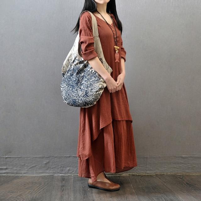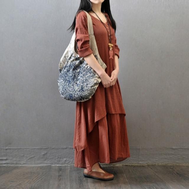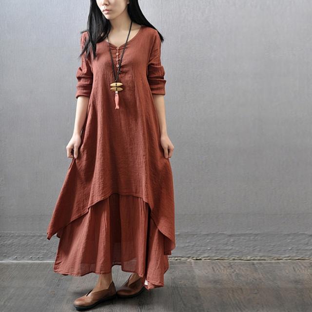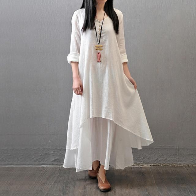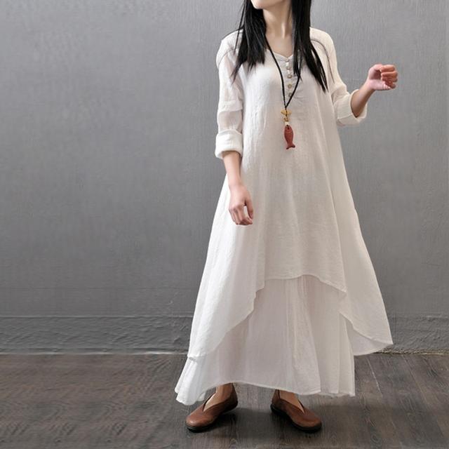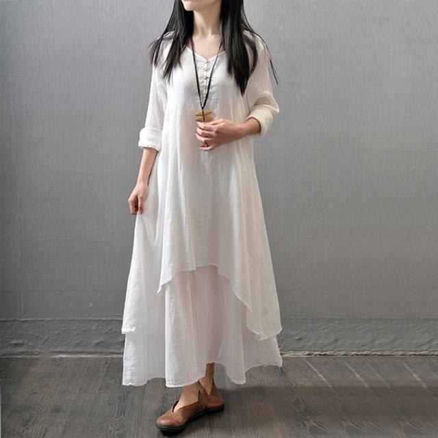 リネン風ワンピース ワンピース レディース 重ね着風ワンピース リネンドレス 長袖 綿麻 ロング丈 シャツワンピース カジュアル おしゃれ Vネック ロング ナチュラル マキシワンピース リネン調 ロングワンピース 大きいサイズ 白 黄色 茶色 ホワイト ジンジャーイエロー