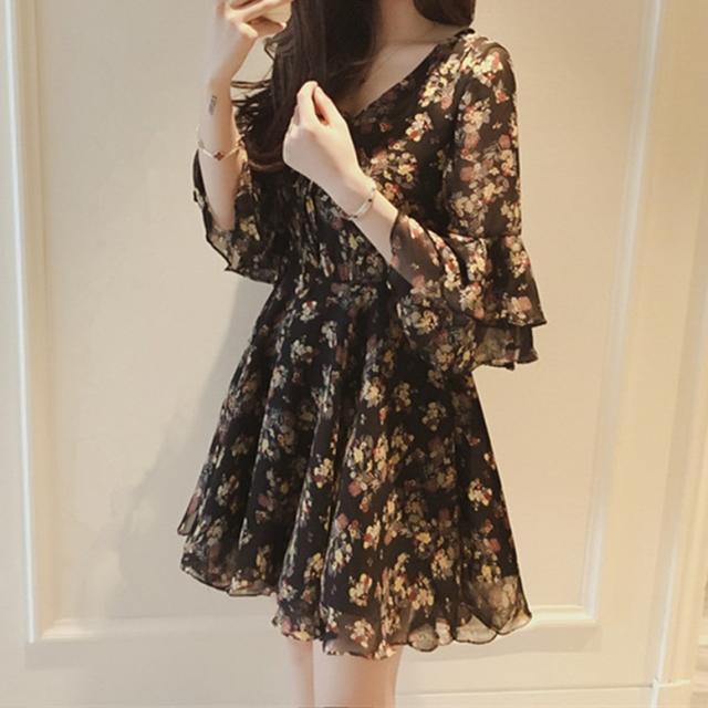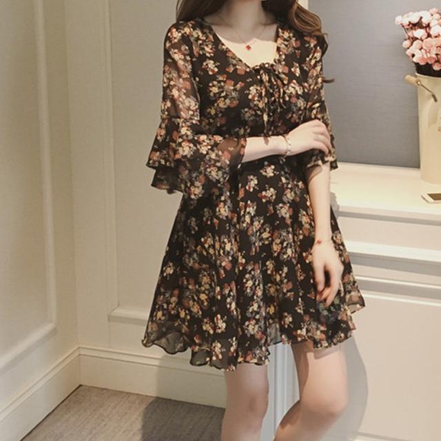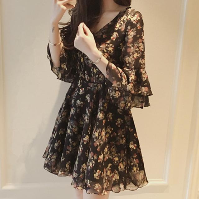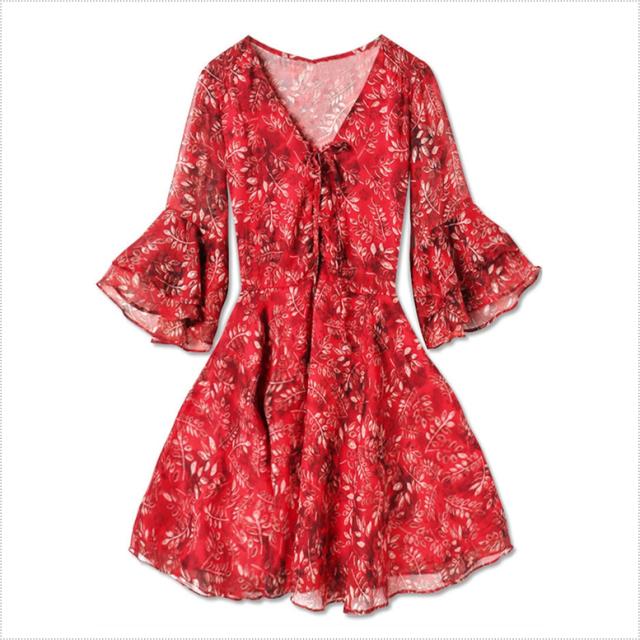 花柄シフォンミニワンピース ワンピース レディース 花柄ワンピース ミニワンピース シフォンワンピース ボタニカル 総柄 プリント ドレス ショート丈 Vネック 7分袖 フレアスリーブ フリル袖 フレア ハイウエスト 黒 赤 ブラック レッド ワンピドレス 大人可愛い きれいめ