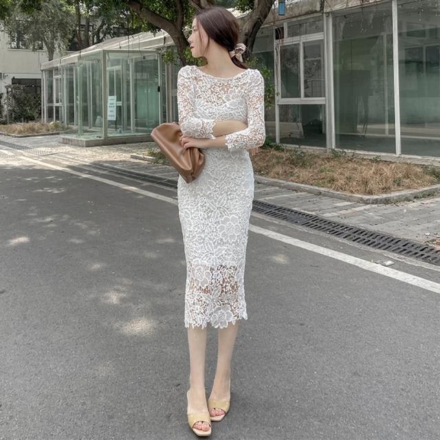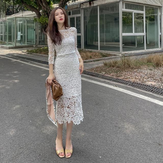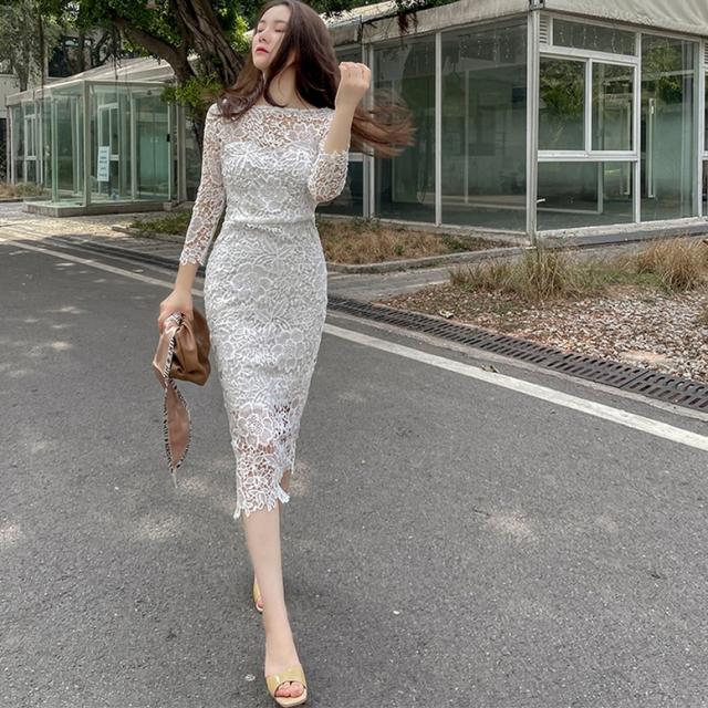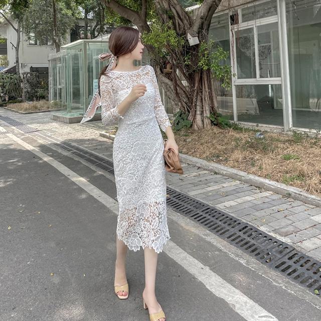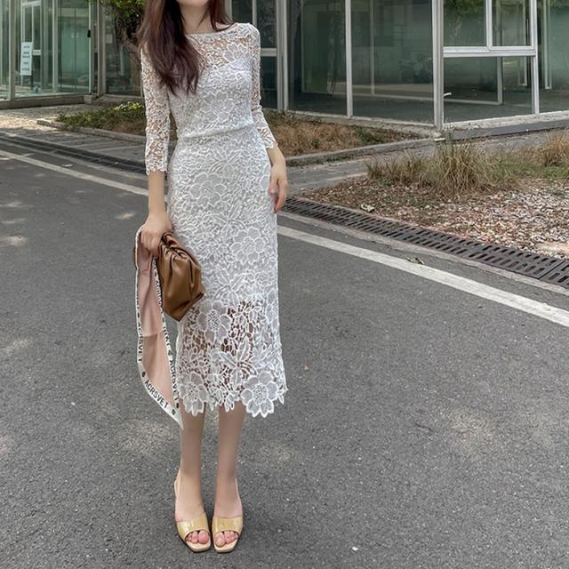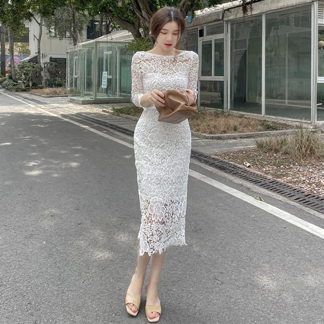 総フラワーレースワンピース ワンピース ドレス レディース 総レースワンピース 結婚式ドレス パーティードレス ミディ丈ドレス タイト 7分袖 花柄 刺繍 レース ボートネック 透け感 シースルー 白 ホワイト ワンピドレス パーティドレス 大人可愛い きれいめ 上品 ガーリー