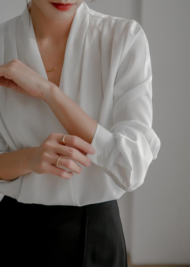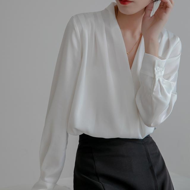 ブラウス 長袖 Vネック レディース サテン 白 ホワイト 紺 ネイビー シフォン サテン セクシー スーツ オールシーズン 春 秋 冬 小顔 ゆったり 大きいサイズ XL 体型カバー オシャレ お洒落 かわいい 大人可愛い きれいめ エレガント 上品 クール かっこいい とろみ 抜け感