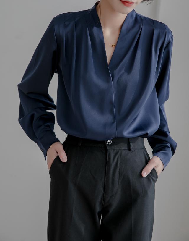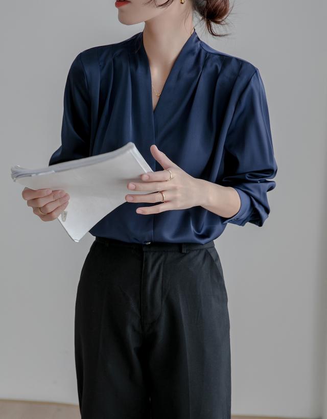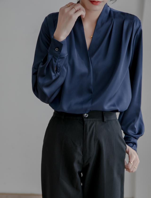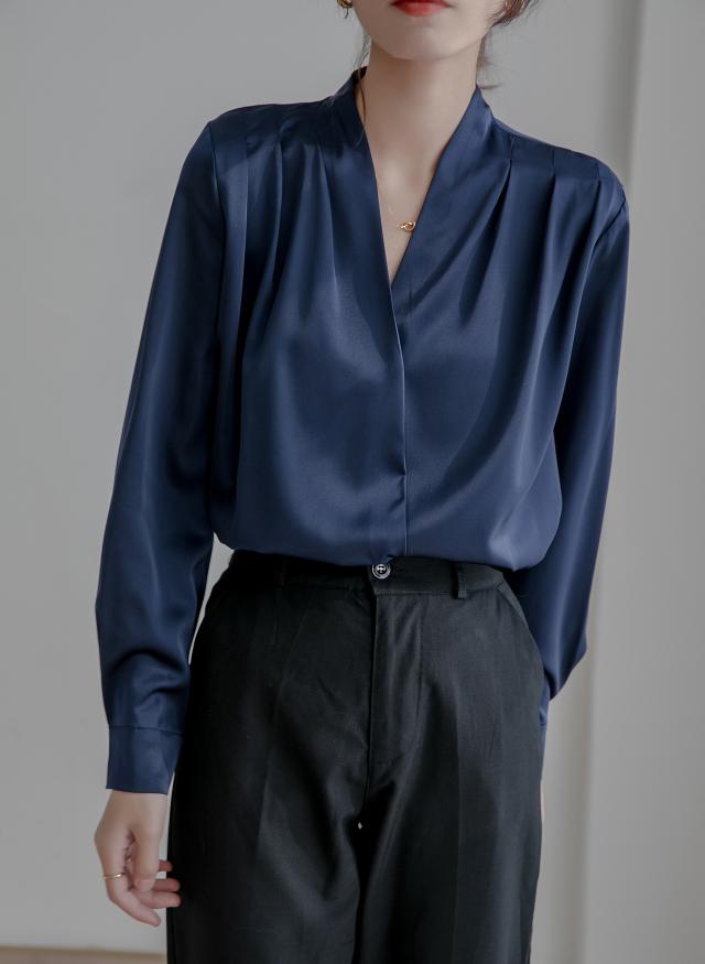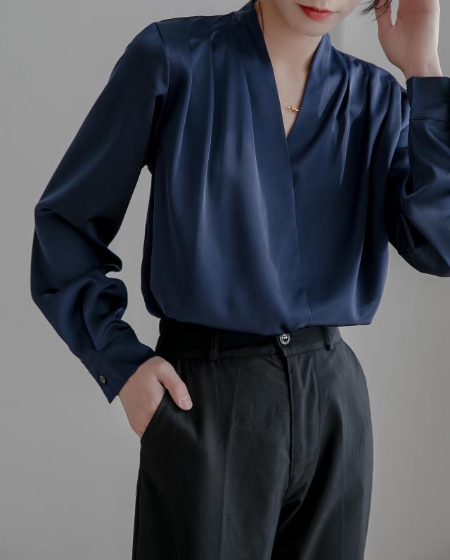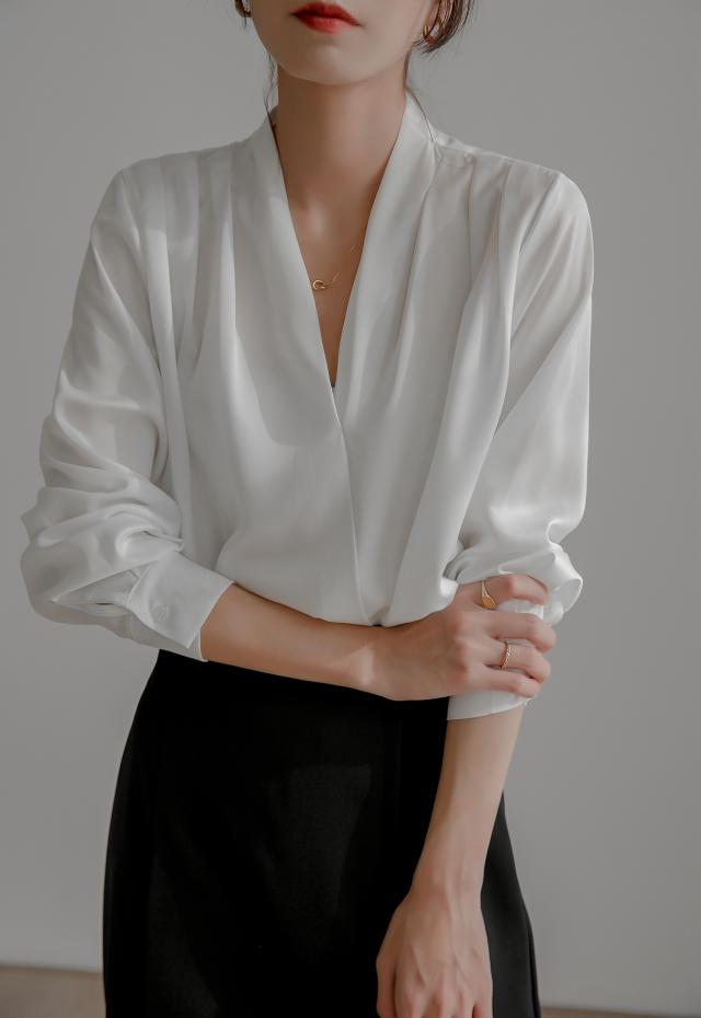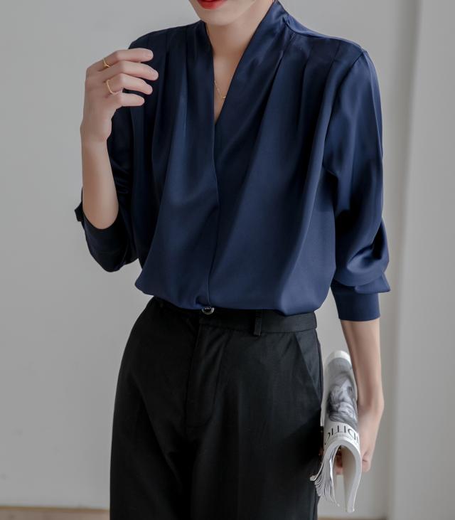 ブラウス 長袖 Vネック レディース サテン 白 ホワイト 紺 ネイビー シフォン サテン セクシー スーツ オールシーズン 春 秋 冬 小顔 ゆったり 大きいサイズ XL 体型カバー オシャレ お洒落 かわいい 大人可愛い きれいめ エレガント 上品 クール かっこいい とろみ 抜け感 こなれ感 ОL オフィス 通勤 入学式 卒業式 パーティー 20代 30代 40代 50代 トップス シャツ Iライン ストレート シンプル 無地 光沢