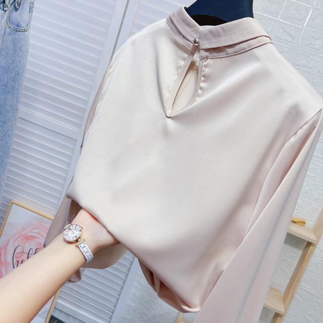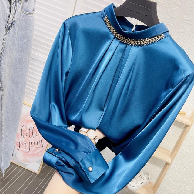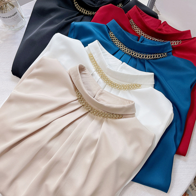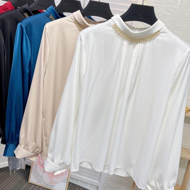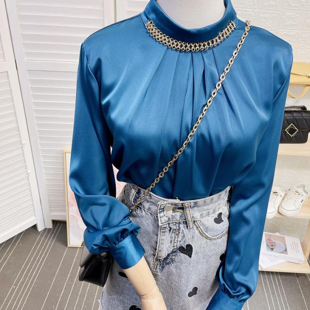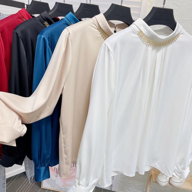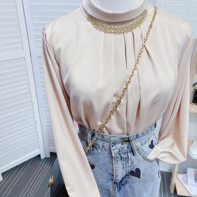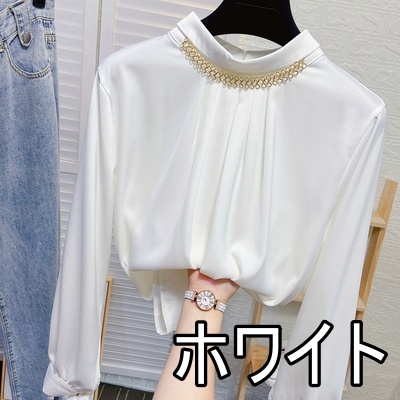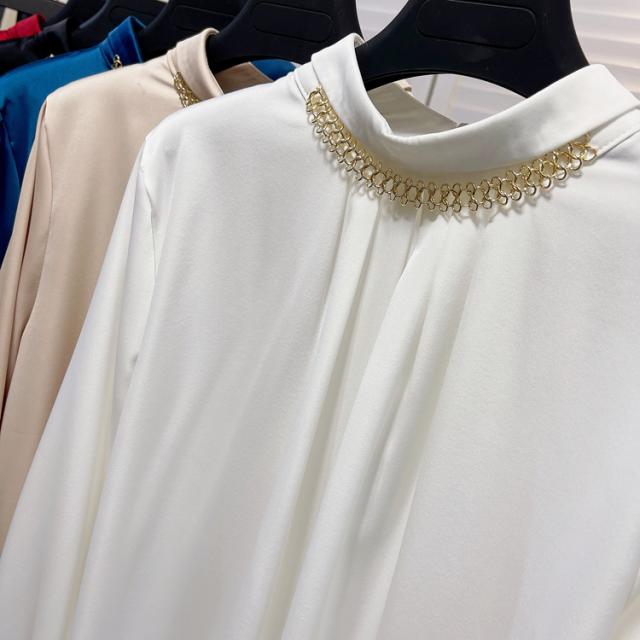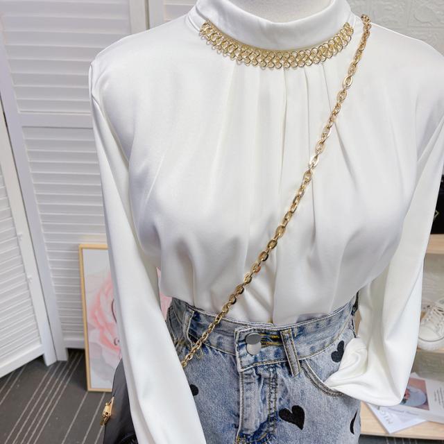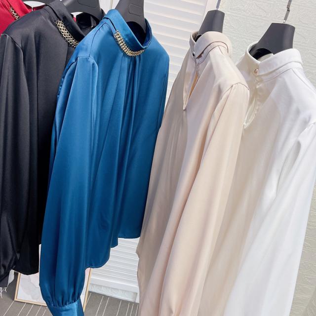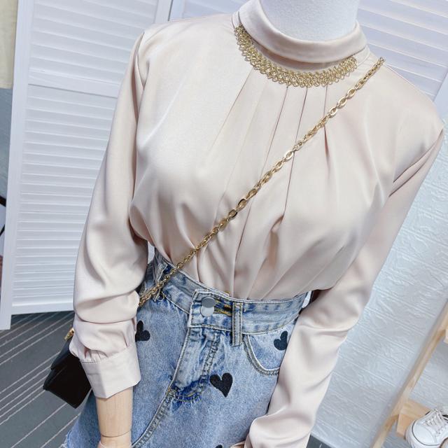 ブラウス 長袖 チェーン スタンドカラー サテン レディース アクセサリー デザインシャツ シャツ トップス くすみカラー 白 ホワイト ベージュ ブルー 青 エキゾチック 個性派 個性的 トレンド 韓国 今っぽ 流行 ギャザー タック 春 秋 冬 スーツ 大きいサイズ 大きめ XL