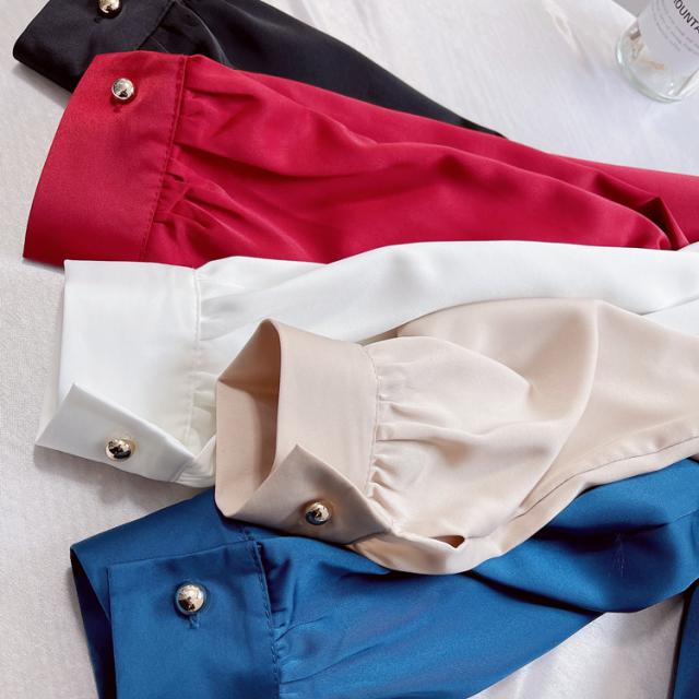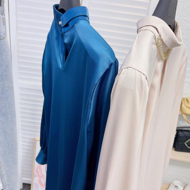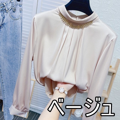 ブラウス 長袖 チェーン スタンドカラー サテン レディース アクセサリー デザインシャツ シャツ トップス くすみカラー 白 ホワイト ベージュ ブルー 青 エキゾチック 個性派 個性的 トレンド 韓国 今っぽ 流行 ギャザー タック 春 秋 冬 スーツ 大きいサイズ 大きめ XL ストレート Iライン 光沢 エレガント きれいめ 上品 高級感 バストアップ 細見え 体型カバー 20代 30代 40代 50代 お洒落 オシャレ かわいい 大人可愛い 大人女子 カジュアル とろみ 抜け感 こなれ感