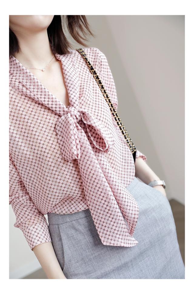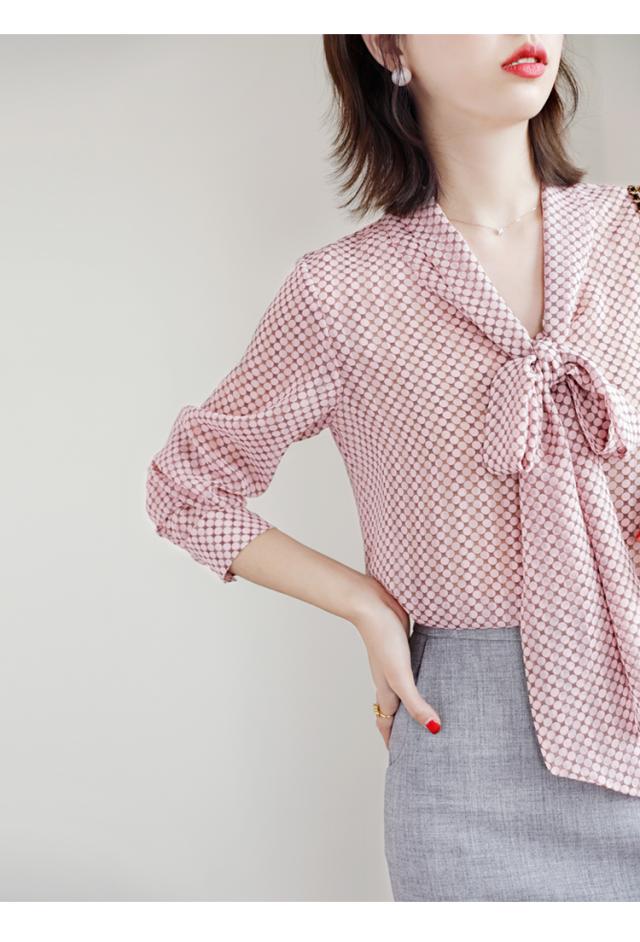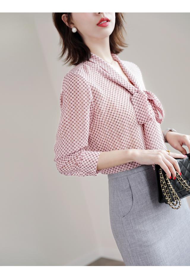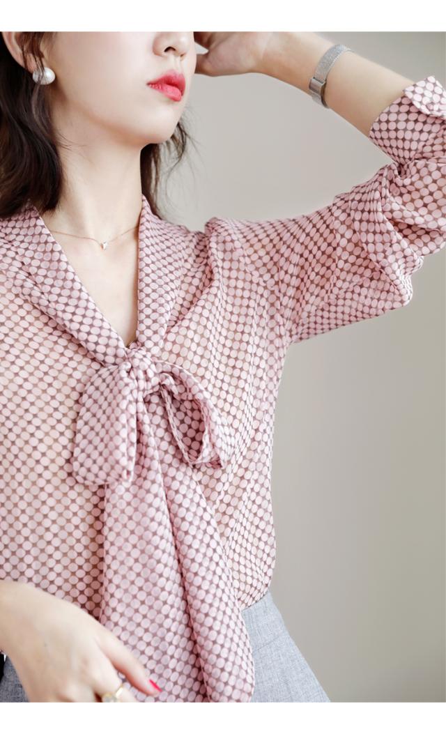 シフォンブラウス ドット 水玉 リボン付き レディース リボン スカーフ 長袖 Vネック シフォン トップス シャツ ブラウス カットソー くすみカラー 抜け感 とろみ お洒落 オシャレ 薄手 オールシーズン 春 夏 秋 冬 かわいい 大人可愛い 大人女子 キュート ガーリー ふんわり ゆったり 大きめ 大きいサイズ XL 体型カバー 個性派 個性的 20代 40代 30代 エレガント ピンク ブラウン 上品 きれいめ ОL オフィス 通勤 デート