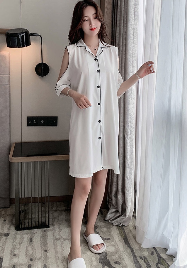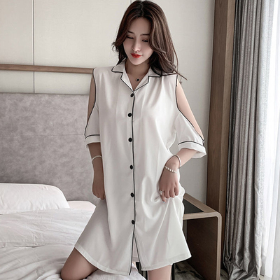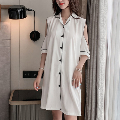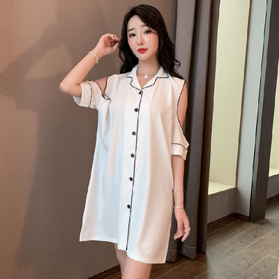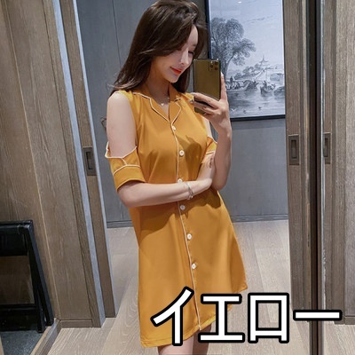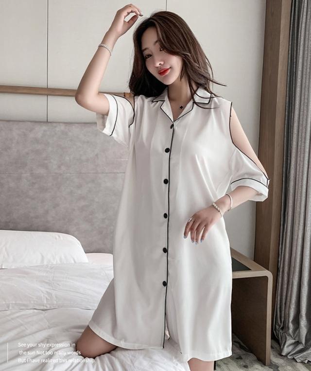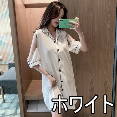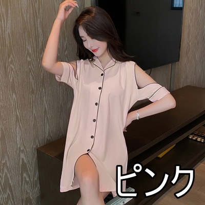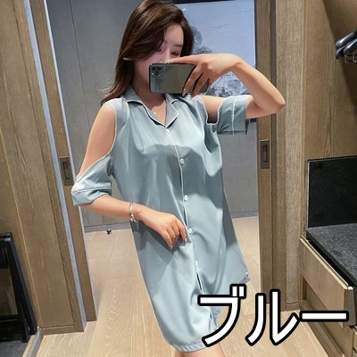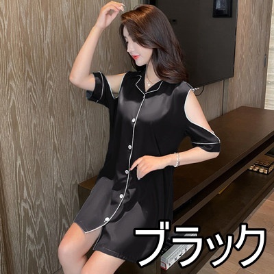 パジャマ ルームウェア ショルダーカット オープンショルダー レディース サテン シャツワンピース デート お泊り 女子会 色っぽ トレンド 韓国 ワンピース 肩出し ロング丈 膝丈 膝上 半袖 春 夏 20代 30代 40代 お洒落 オシャレ セクシー かわいい 大人可愛い 大人女子
