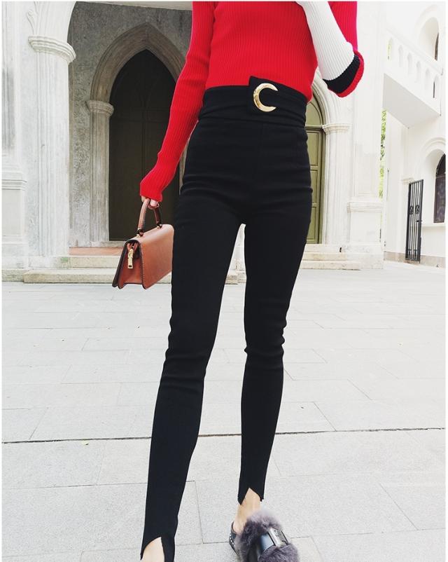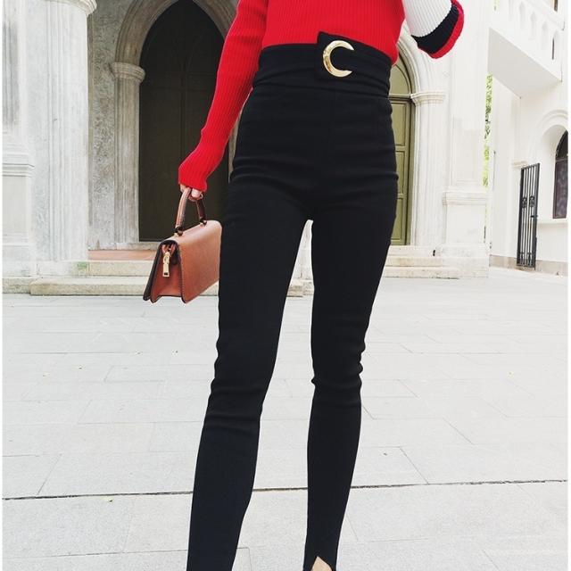 スキニー ハイウエスト バックル レディース タイト スリム 細見え 脚長 美脚 スリット 裾スリット ボトムス パンツ ズボン ロング丈 長ズボン スキニーパンツ レギンスパンツ 黒 ブラック 無地 シンプル カジュアル きれいめ セクシー オシャレ お洒落 20代 30代 40代 小さめ