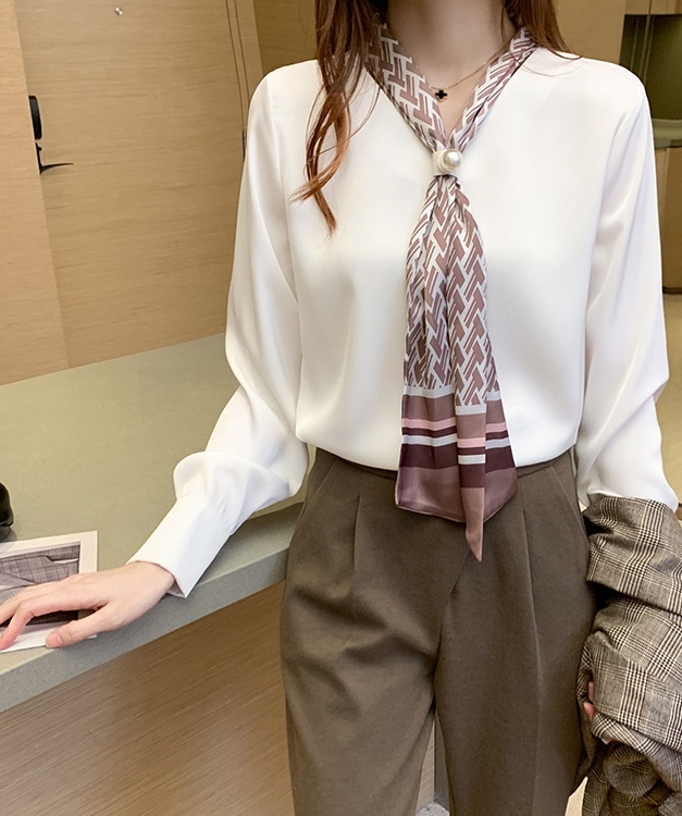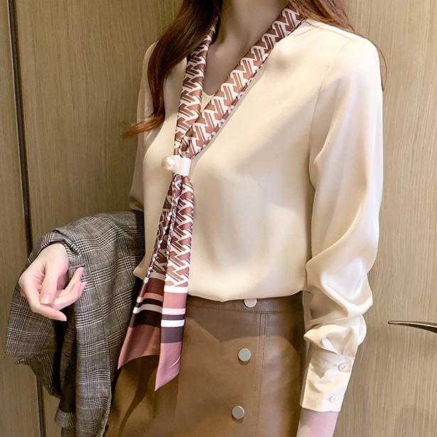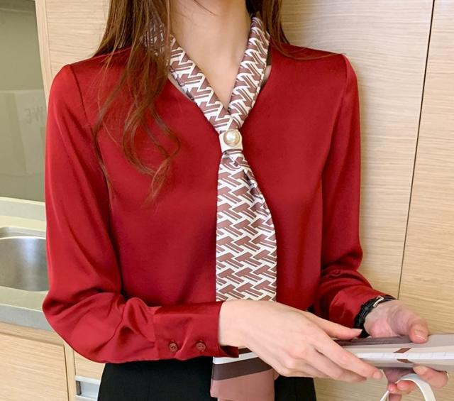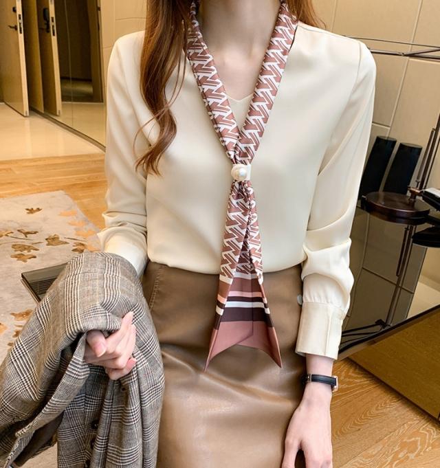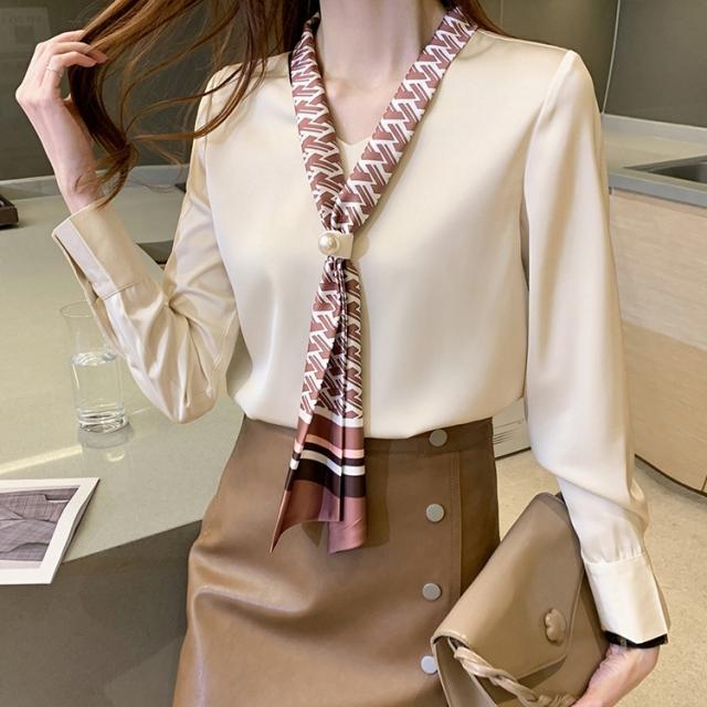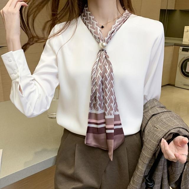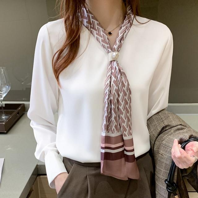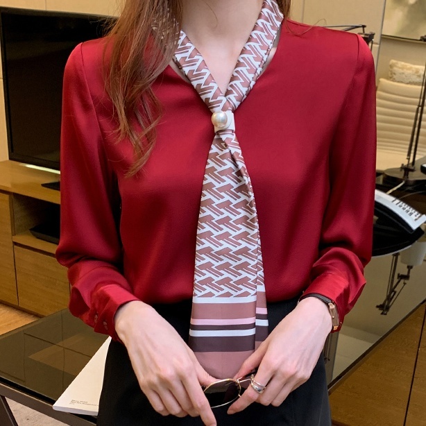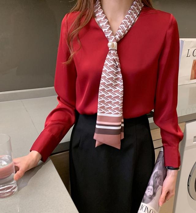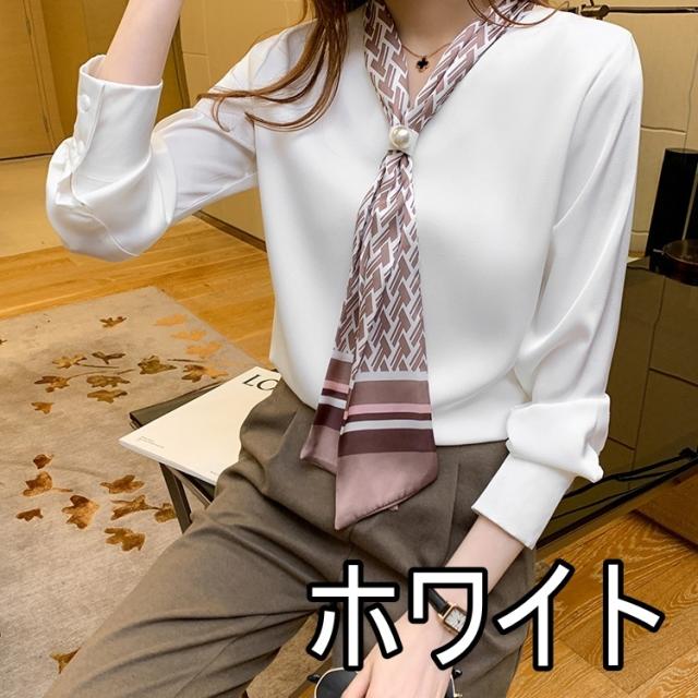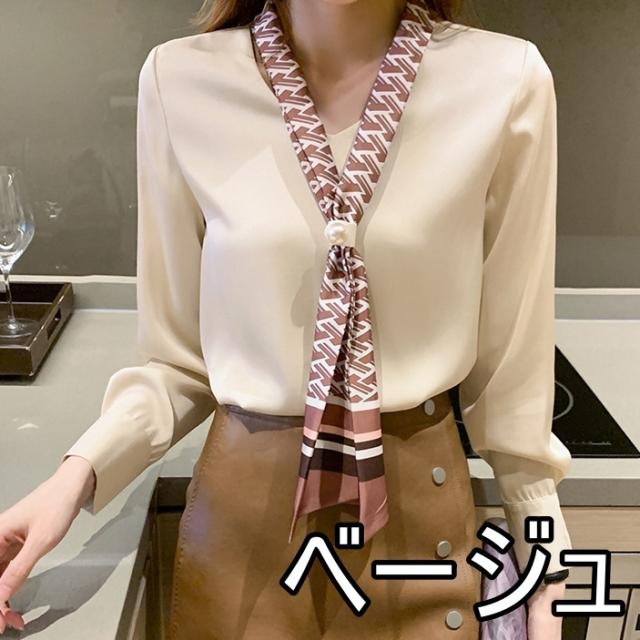 ブラウス スカーフ 4色 長袖 レディース パール リボン Vネック シフォン サテン トップス シャツ シフォンブラウス カットソー 春 秋 冬 くすみカラー お洒落 オシャレ きれいめ 清楚 上品 エレガント 高級感 クール ゴージャス かわいい 大人可愛い 大きいサイズ 大きめ XL 2XL 白 ホワイト ベージュ 赤 レッド 青 ブルー 水色 小顔 細見え20代 30代 40代 50代 ОL 通勤 オフィス 仕事 個性的 個性派 エスニック エキゾチック こなれ感 とろみ