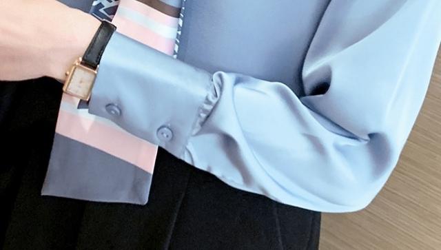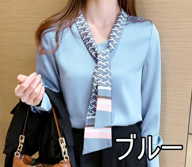 ブラウス スカーフ 4色 長袖 レディース パール リボン Vネック シフォン サテン トップス シャツ シフォンブラウス カットソー 春 秋 冬 くすみカラー お洒落 オシャレ きれいめ 清楚 上品 エレガント 高級感 クール ゴージャス かわいい 大人可愛い 大きいサイズ 大きめ XL
