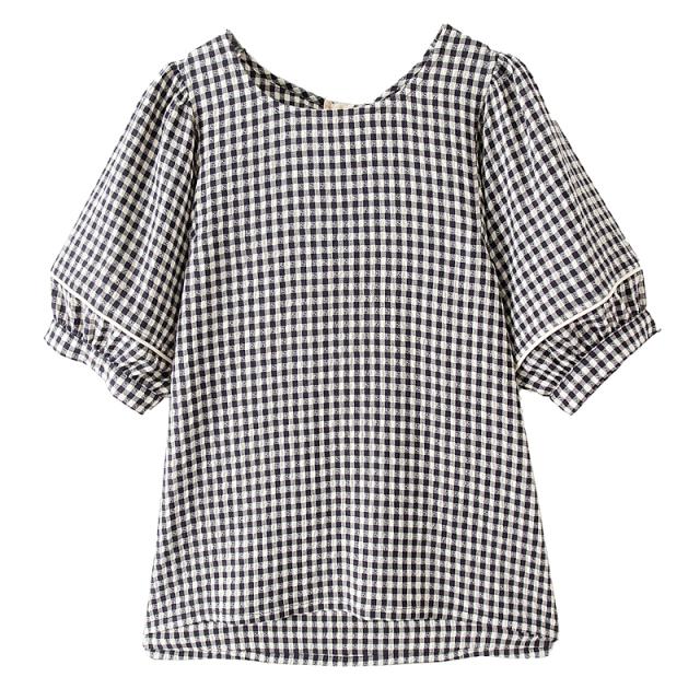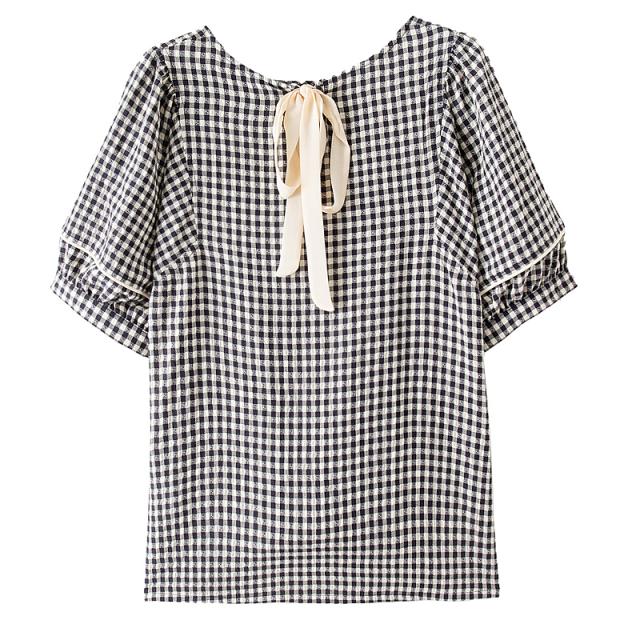 バックリボン チェック パフスリーブ トップス ブラウス レディース バックデザイン 大きめ ゆったり 大きめサイズ 上品 エレガント こなれ感 おしゃれ オシャレ 春 夏 半袖 5分袖 ふんわり ガーリー キュート 可愛い 大人可愛い 大人女子 ゆめかわ