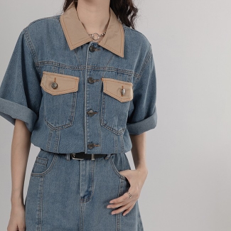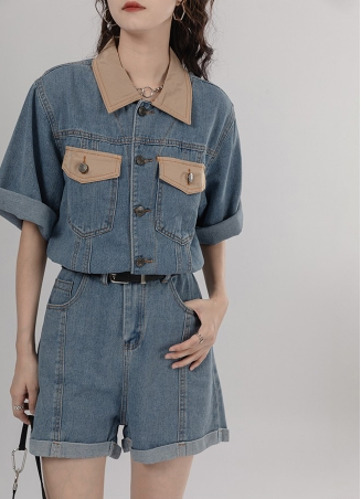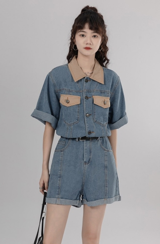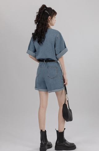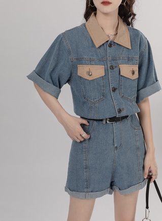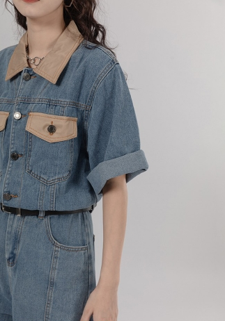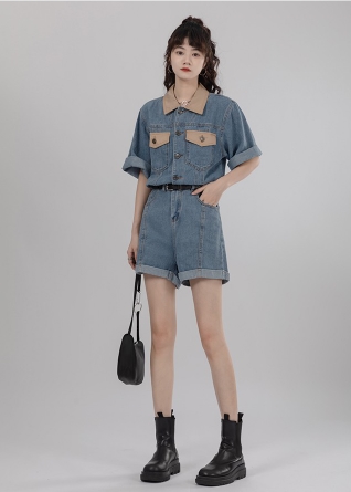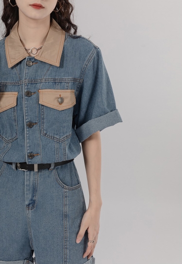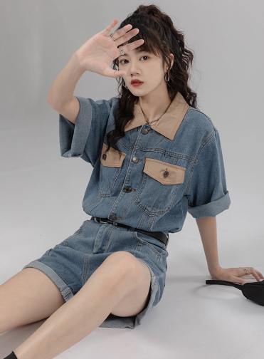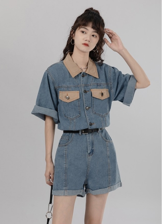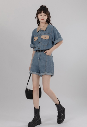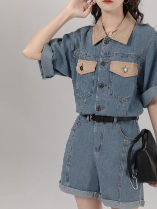 シャツ オールインワン サロペット ジャンプスーツ ドッキング パンツ ドレス ショートパンツ スタイル ウエスト 襟付き ショート丈 ミニ丈 ミニ 袖あり 半袖 デニム ネック ゆったり Aライン かわいい きれいめ 上品 ラブリー キュート ガーリー 個性的 無地 春 夏 秋 冬
