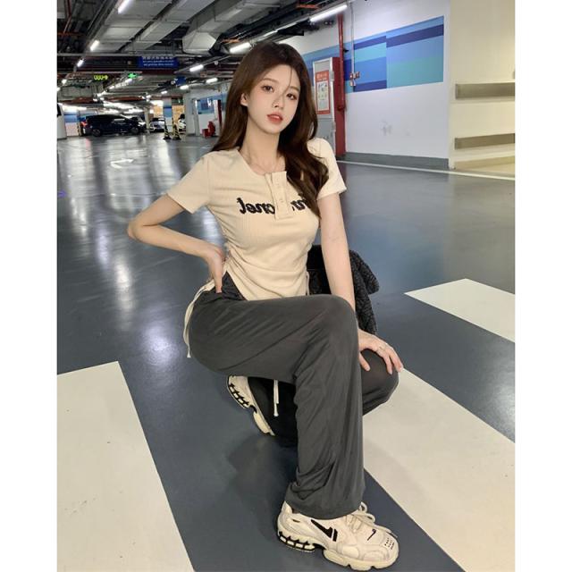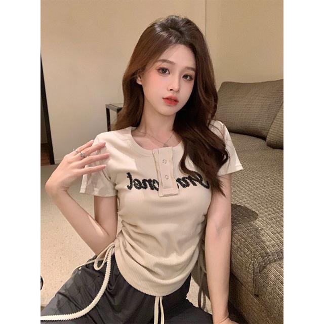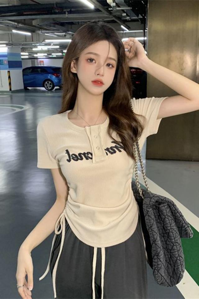 ドロストデザイン トップス 半袖 カットソー レディース ロゴ ラウンドネック 夏 春 秋 タイト スリム 細身 細見え 小顔 鎖骨 デコルテ シャープ クール 20代 30代 40代 50代 ОL 通勤 オフィス オフィスカジュアル くすみカラー こなれ感 ラフ 薄手 スリム タイト Tシャツ