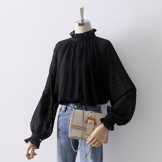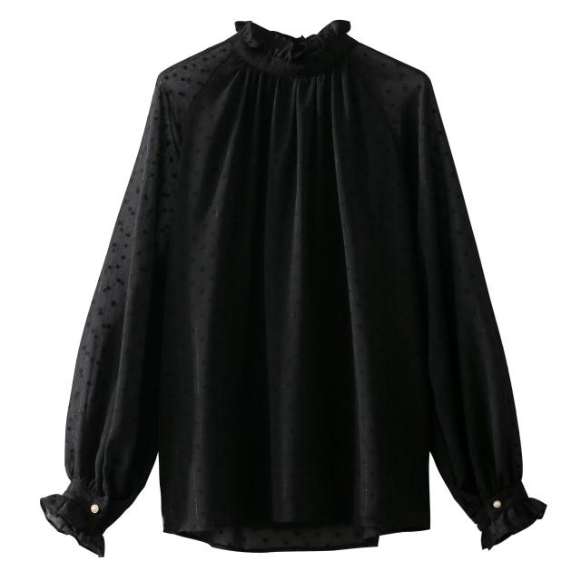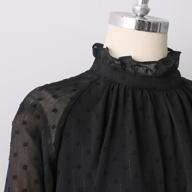 トップス レディース ブラウス カットソー プルオーバー 袖あり 長袖 ベルスリーブ ハイネック ギャザー シャーリング シフォン シースルー 透け感 かわいい 大人可愛い きれいめ シンプル 大人 上品 おしゃれ お洒落 レトロ 大人女子 こなれ感 エレガント とろみ感 抜け感 S M L 黒 ブラック ドット柄 水玉 ストライプ 春 夏 秋 10代 20代 30代 40代 50代 ママ オフィス ビジネス OL 通勤 学生 通学 デート お出かけ 女子会 休日 パーティー イベント 旅行 普段使い