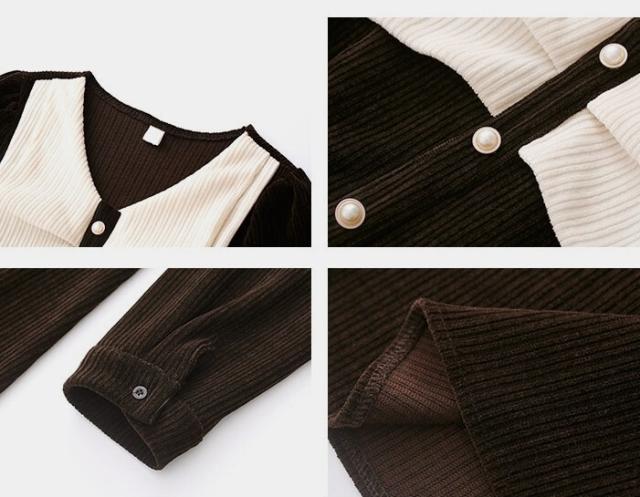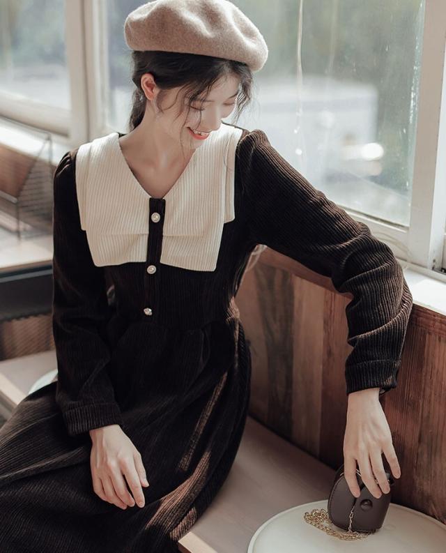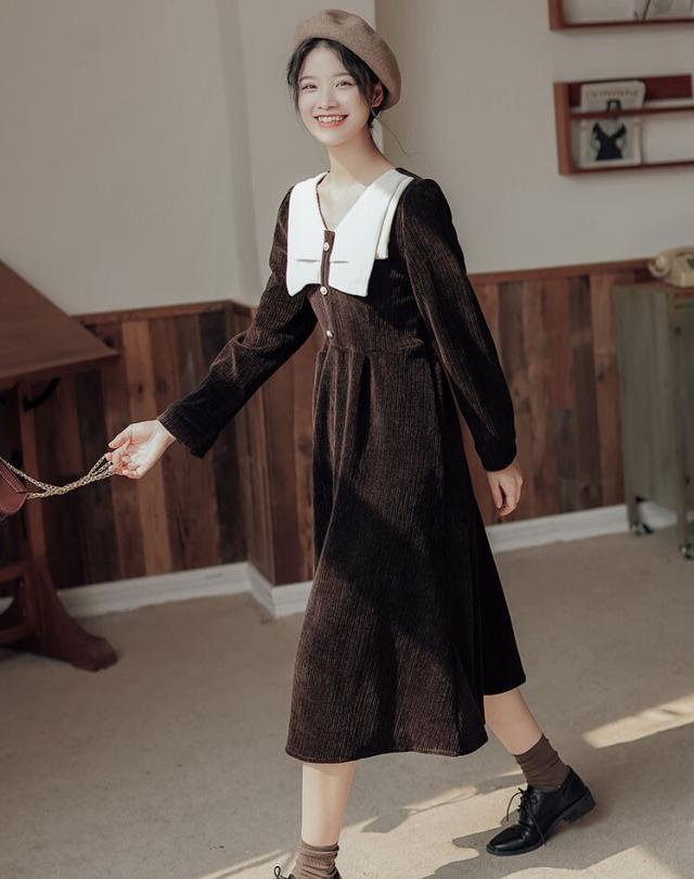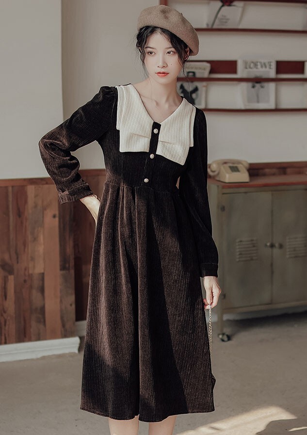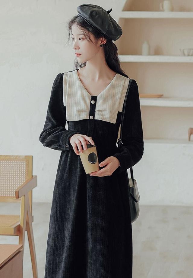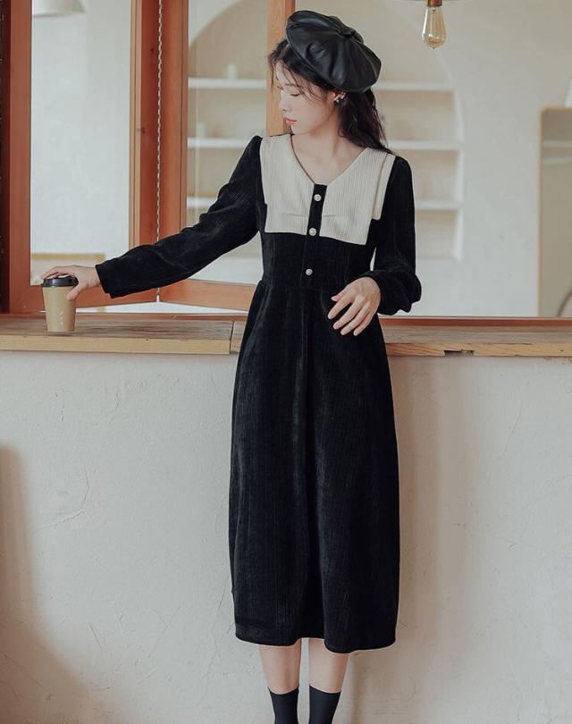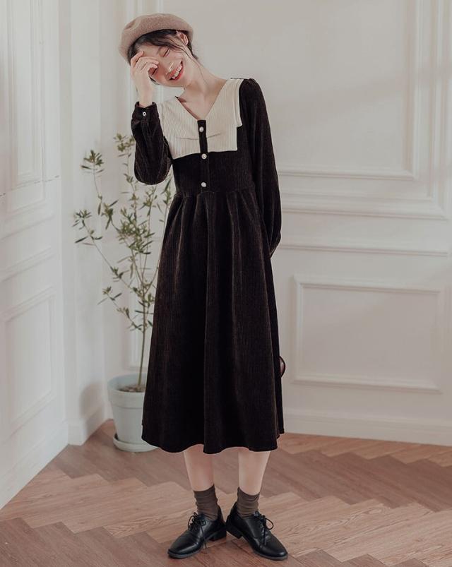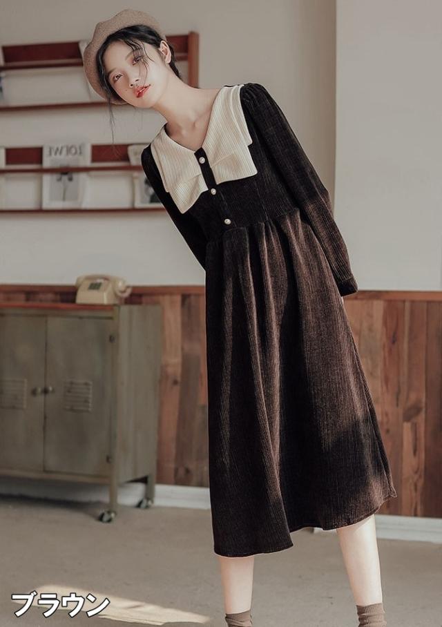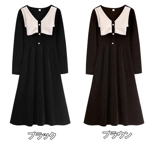 ワンピース レディース ミディワンピ S M L ブラウン 茶色 ブラック 黒 大人カラー くすみカラー 秋カラー 無地 バイカラー 秋 冬 長袖 Vネック コーデュロイ フロントボタン ミドル丈 ミドル ミディ丈 ミディ 膝下 膝丈 フレア Aライン ハイウエスト 脚長 スタイルアップ 体型カバー 着やせ ママ フェミニン ナチュラル きれいめ きれカジ カジュアル モテ ガーリー キュート 大人 大人可愛い 存在感 主役級 こなれ感 ぬけ感 デート お出かけ 休日 モード 学生 韓国 オルチャン