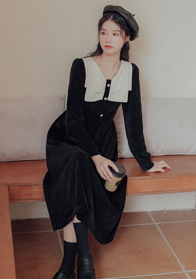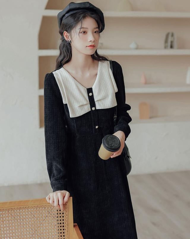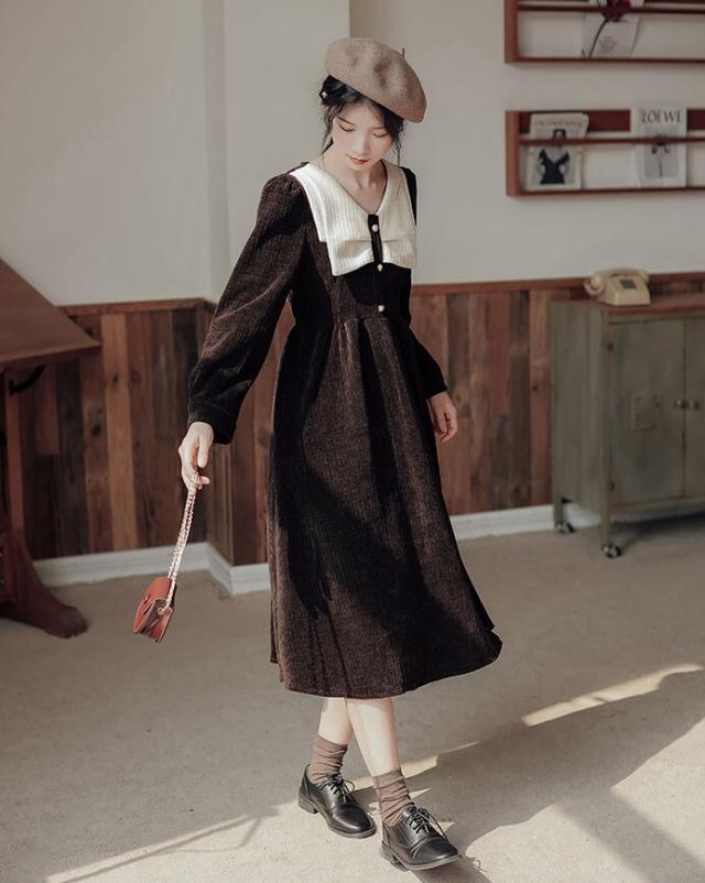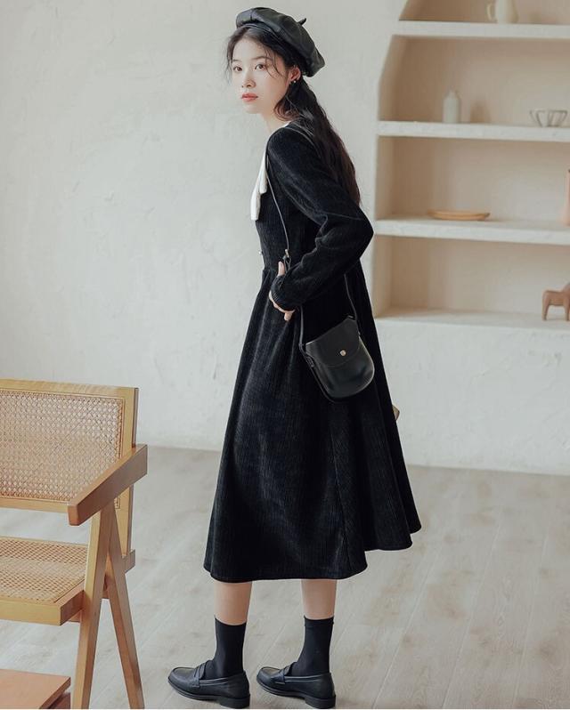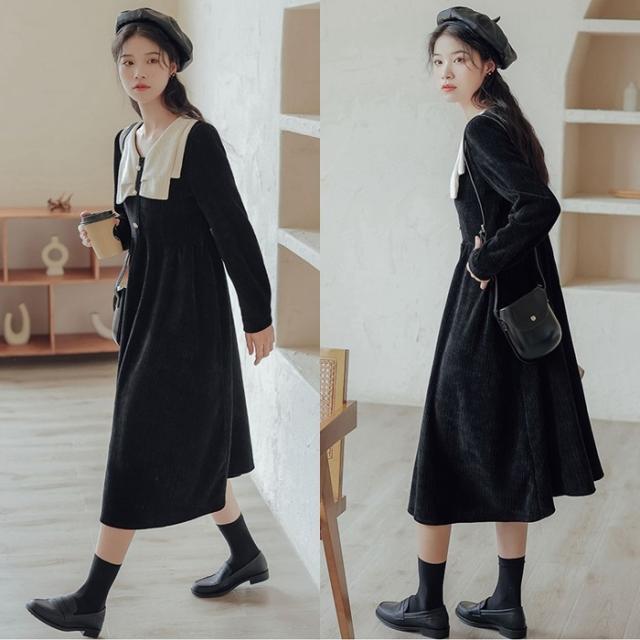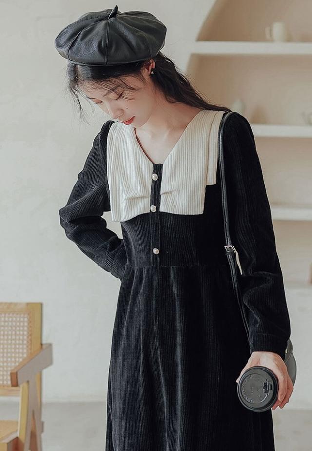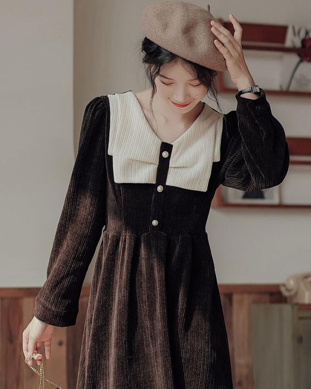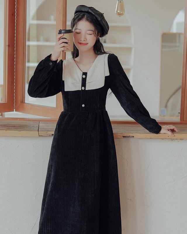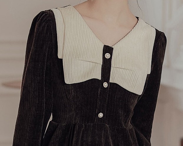 ワンピース レディース ミディワンピ S M L ブラウン 茶色 ブラック 黒 大人カラー くすみカラー 秋カラー 無地 バイカラー 秋 冬 長袖 Vネック コーデュロイ フロントボタン ミドル丈 ミドル ミディ丈 ミディ 膝下 膝丈 フレア Aライン ハイウエスト 脚長 スタイルアップ 体型カバー 着やせ ママ フェミニン ナチュラル きれいめ きれカジ カジュアル モテ ガーリー キュート 大人 大人可愛い 存在感 主役級 こなれ感 ぬけ感 デート お出かけ 休日 モード 学生 韓国 オルチャン