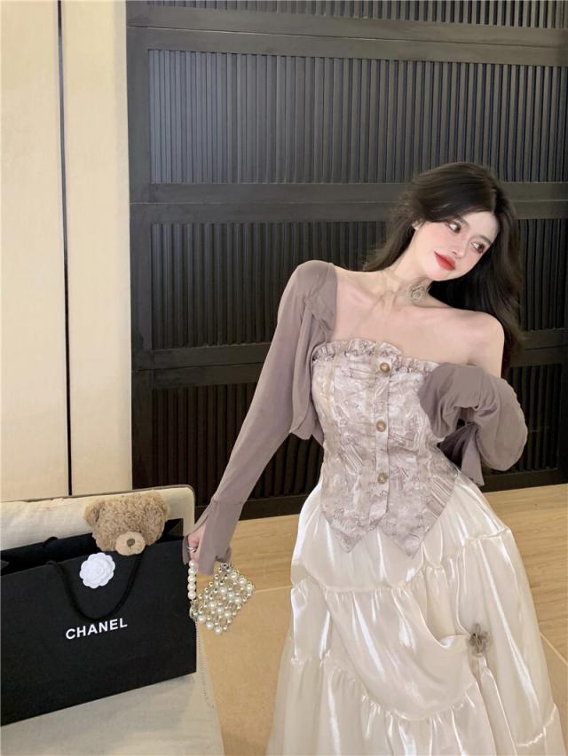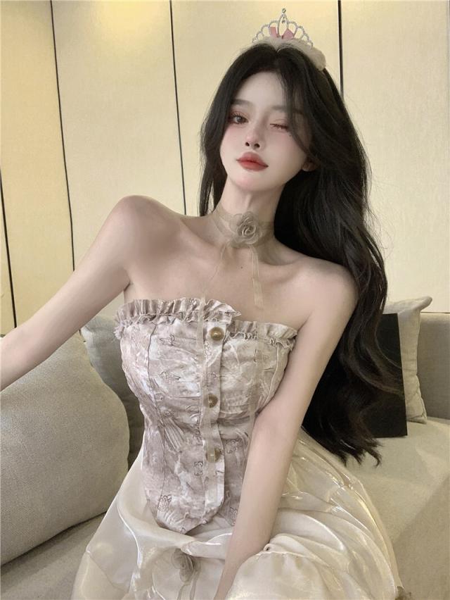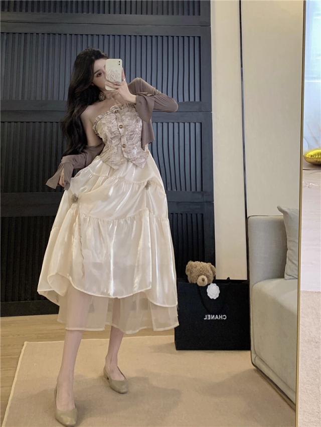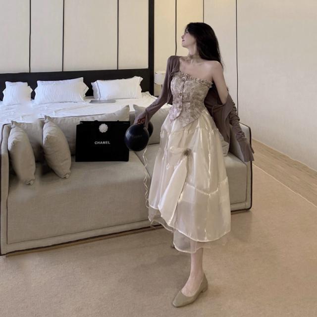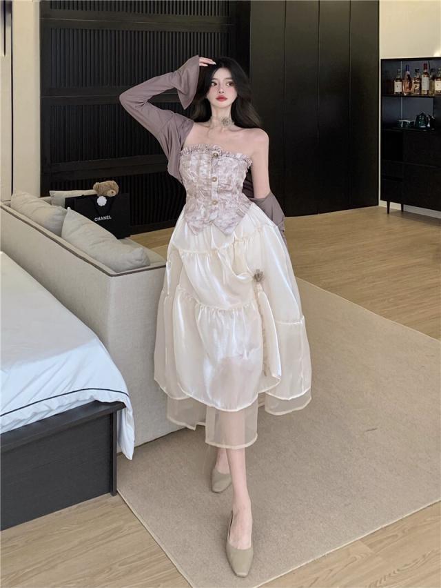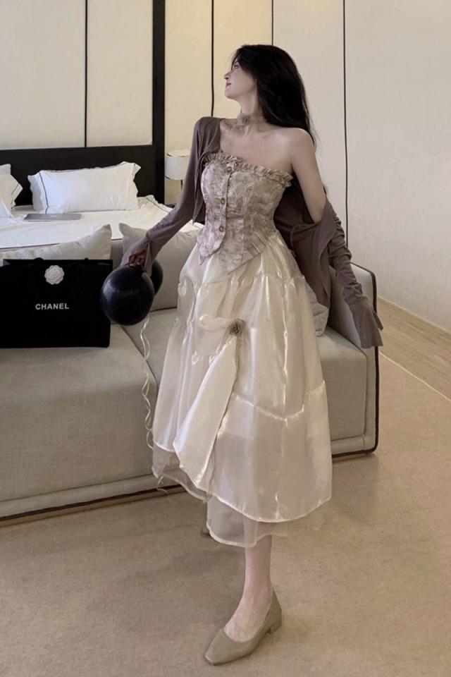 セット商品 チューブトップワンピース ミディアムワンピース ワンピース レディース クラシカルワンピース ミモレ丈 ドレス 肩見せ ウエストシェイプ ひざ下丈 大人可愛い きれいめ 上品 レトロ キュート ガーリー エレガント フォーマル 春 夏 秋 冬 オールシーズン 二次会