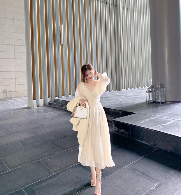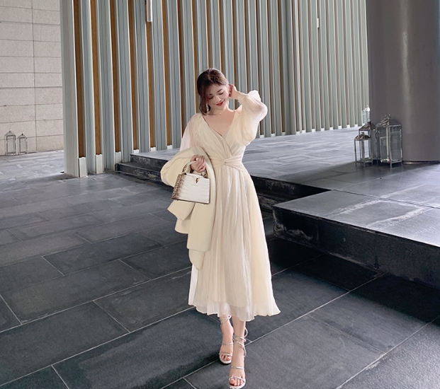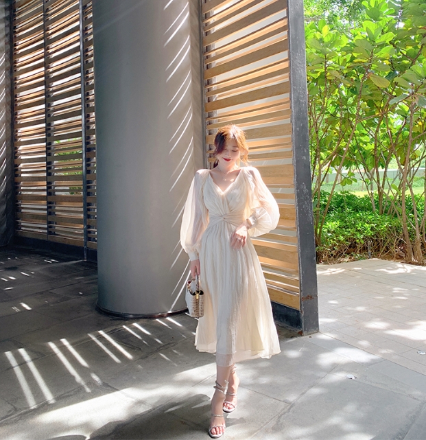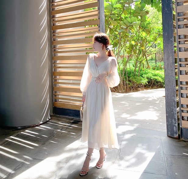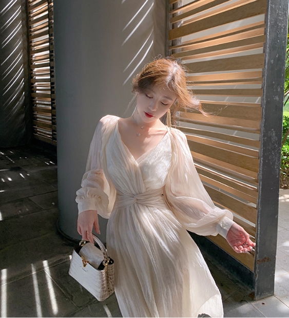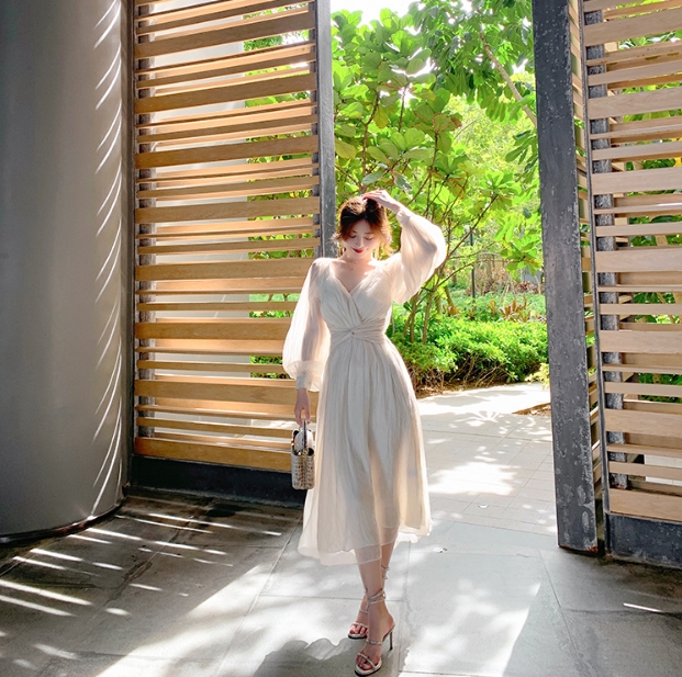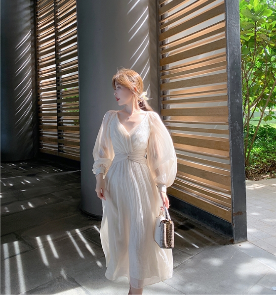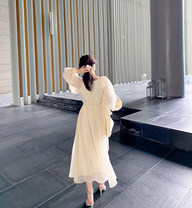 妖精 ワンピース フレアワンピース ワンピドレス ミモレ丈 袖あり 長袖 ボリューム袖 パフスリーブ Vネック フレア シフォン ウエストマーク 透け感 薄手 大人可愛い きれいめ シンプル 上品 ラブリー キュート エレガント 抜け感 無地 春 10代 20代 30代 40代 レディース
