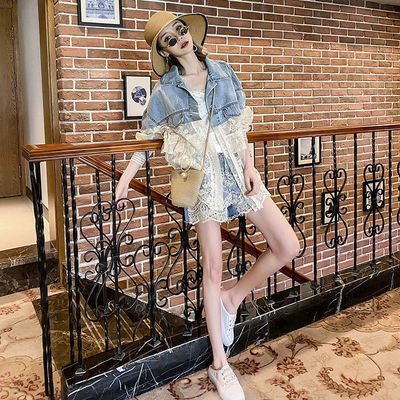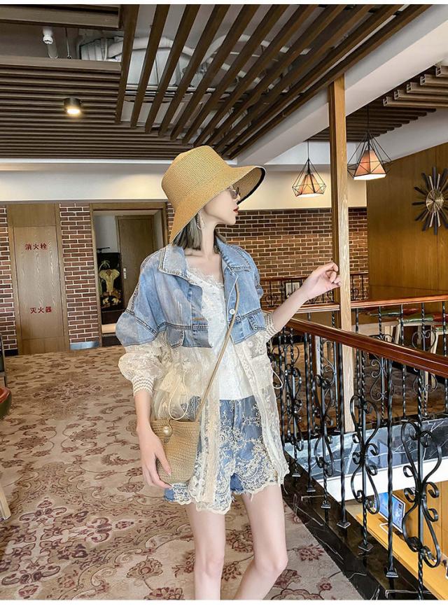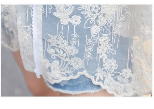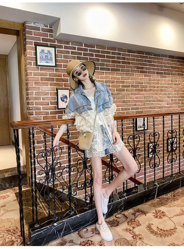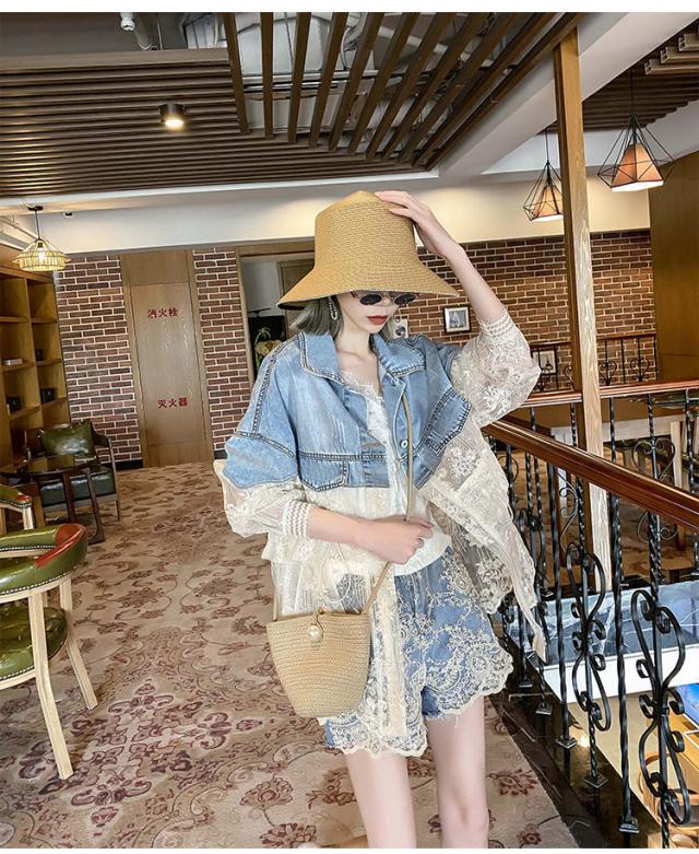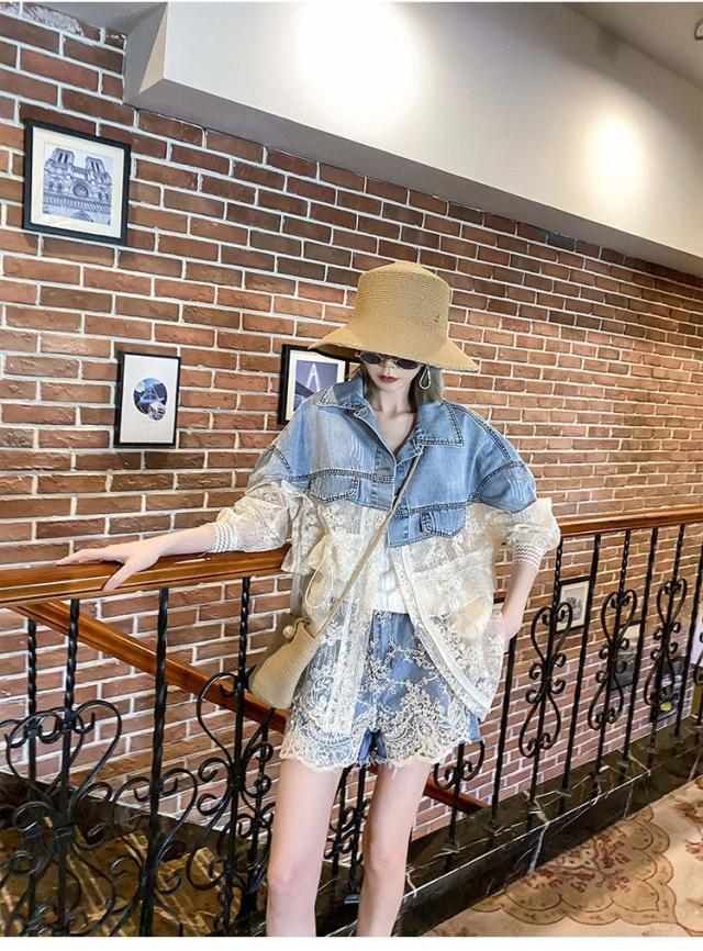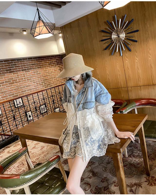 総レース デニムジャケット 長袖 レディース 日焼け デニム トップス カーディガン レース こなれ感 ラフ ロング丈 ショート丈 切り替え ドッキング 羽織 春 夏 20代 30代 40代 お洒落 オシャレ 大人女子 可愛い 大人可愛い トレンド 韓国 個性派 個性的 UV 透け感 抜け感