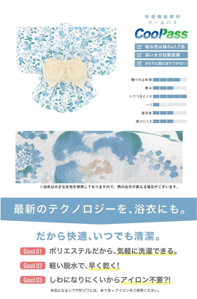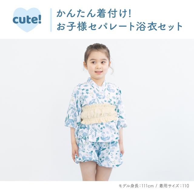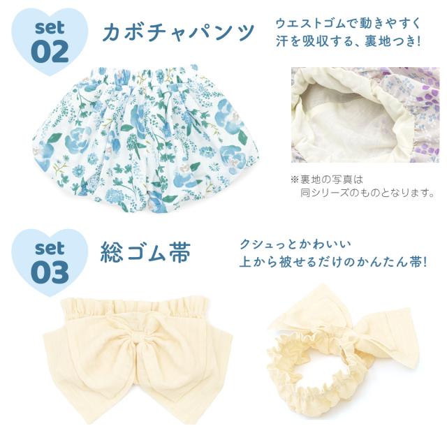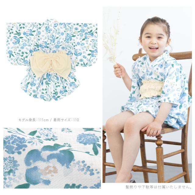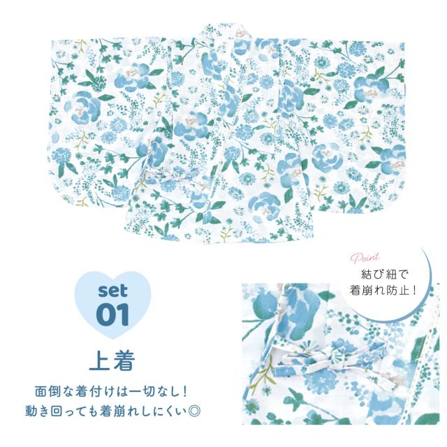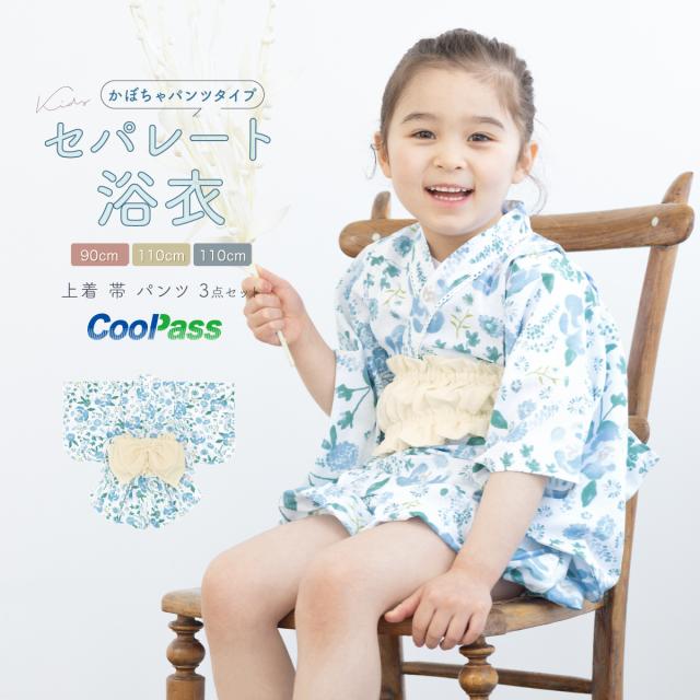 浴衣 子供 セパレート 女の子 ベビー 浴衣セット かぼちゃパンツ 帯 3点セット SOUBIENオリジナル 吸水速乾 CoolPass 水色 クリーム ボタニカル 90 100 110 2024 送料無料