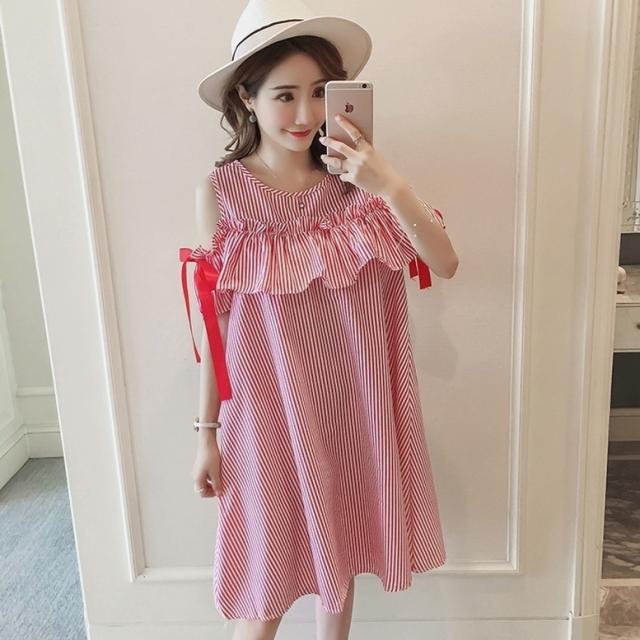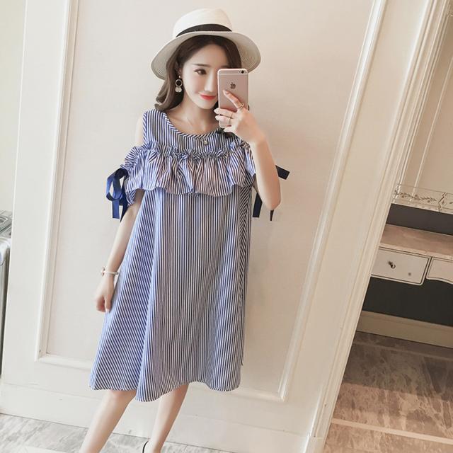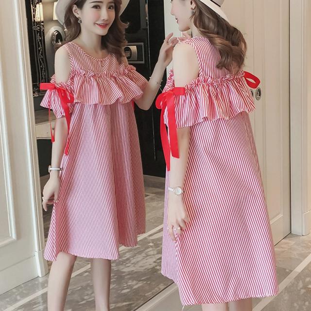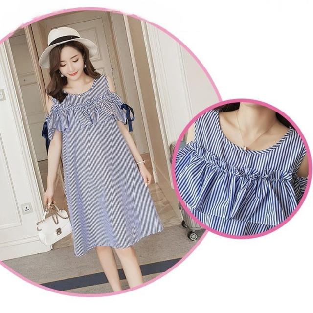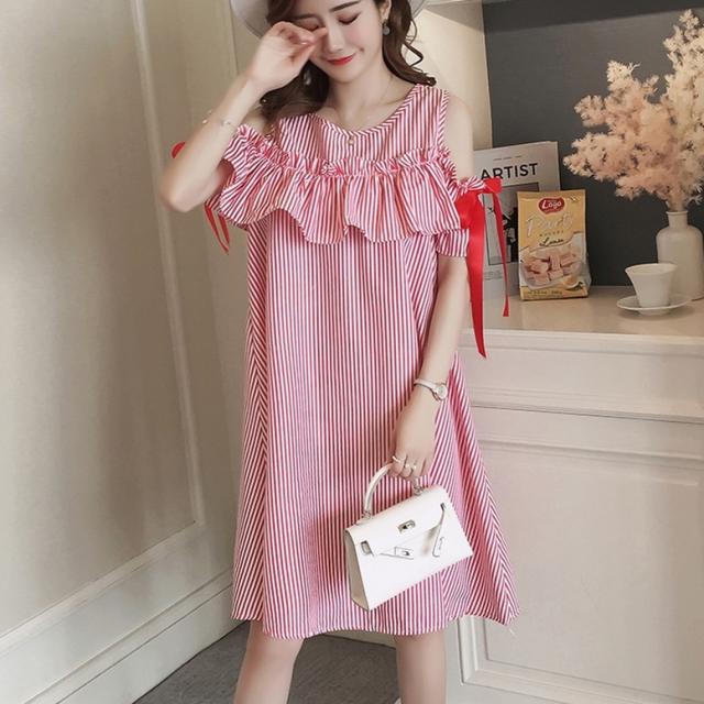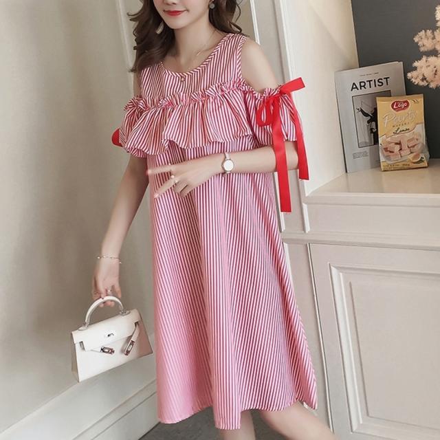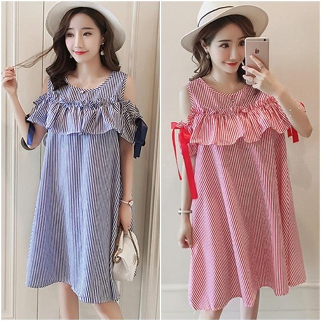 ストライプオフショルシャツワンピース ワンピース レディース ひざ丈ワンピース ストライプ柄 袖あり フリル 袖リボン オフショルダー プリント ドレス ショート丈 ラウンドネック 青 赤 ブルー レッド ワンピドレス 大人可愛い きれいめ 上品 エレガント フォーマル