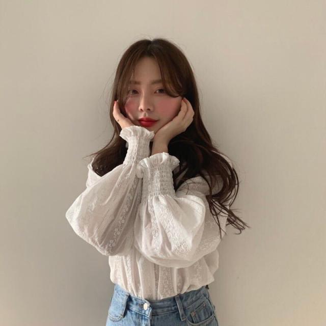 トップス ブラウス レース 長袖 レディース ランタンスリーブ ボリューム シャツ フリル 透け感 エレガント 上品 清楚 高級感 きれいめ かわいい 大人可愛い ガーリー フェミニン カジュアル お洒落 オシャレ ゆったり 体型カバー 着痩せ 白 ホワイト 無地 韓国 トレンド 流行
