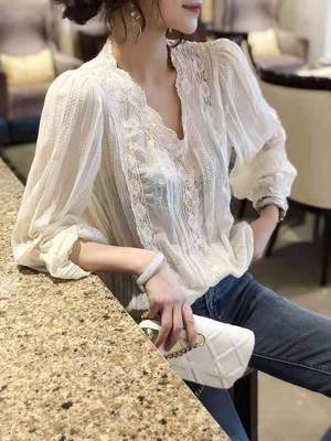 トップス ブラウス 総レース 長袖 レディース Vネック シャツ フリル スカラップ 透け感 エレガント 上品 清楚 高級感 きれいめ かわいい 大人可愛い ガーリー フェミニン カジュアル お洒落 オシャレ ゆったり 体型カバー 着痩せ 白 ホワイト 無地 韓国 トレンド 流行 春 夏