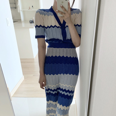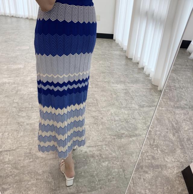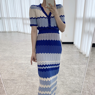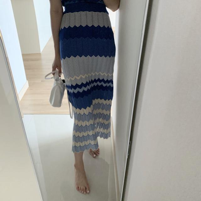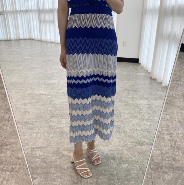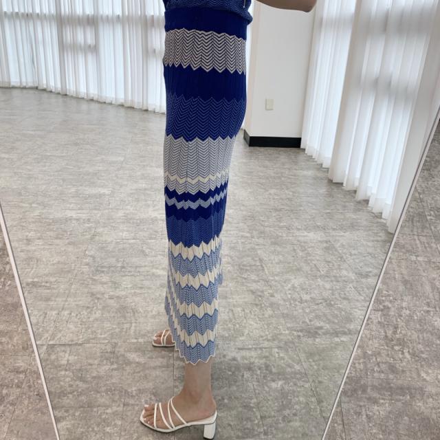 セットアップ 上下セット ニット ボーダー レディース ロングスカート ミモレ丈 ロング ハイウエスト 美脚 脚長 トップス ニットソー 前開き Vネック 半袖 タイト スリム 細身 マーエイド 裾 フレア 青 ブルー ストライプ オシャレ お洒落 ニットソー レトロ ヴィンテージ