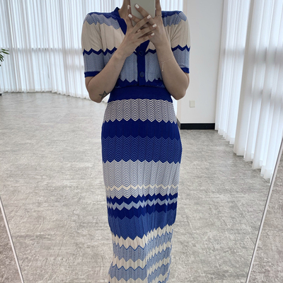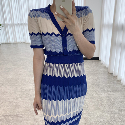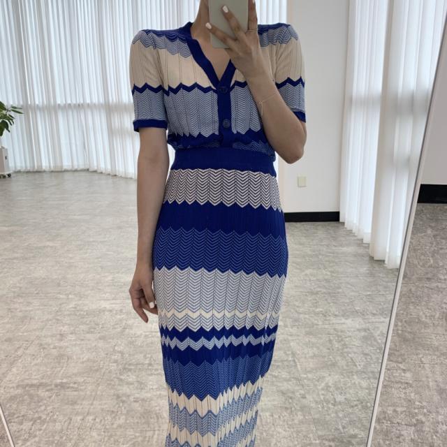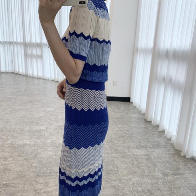 セットアップ 上下セット ニット ボーダー レディース ロングスカート ミモレ丈 ロング ハイウエスト 美脚 脚長 トップス ニットソー 前開き Vネック 半袖 タイト スリム 細身 マーエイド 裾 フレア 青 ブルー ストライプ オシャレ お洒落 ニットソー レトロ ヴィンテージ かわいい 大人可愛い 春 夏 秋 きれいめ 上品 エレガント きれいめ 高級感 小顔 すっきり クール シック 20代 30代 40代 カジュアル こなれ感 ショート丈 映え SNS デート 女子会 モテ 休日 個性的 個性派