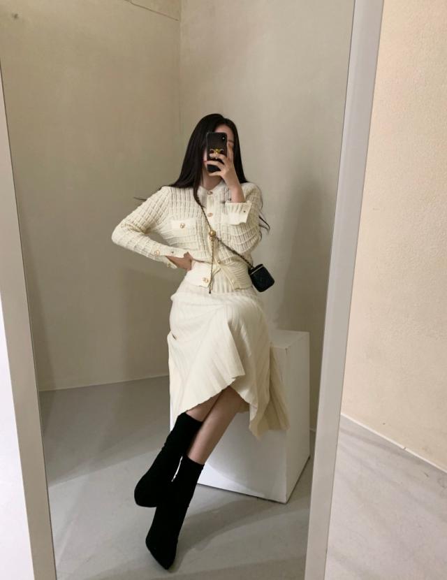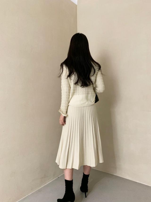 細かめのプリーツスカートは、エレガントで上品な印象です。
