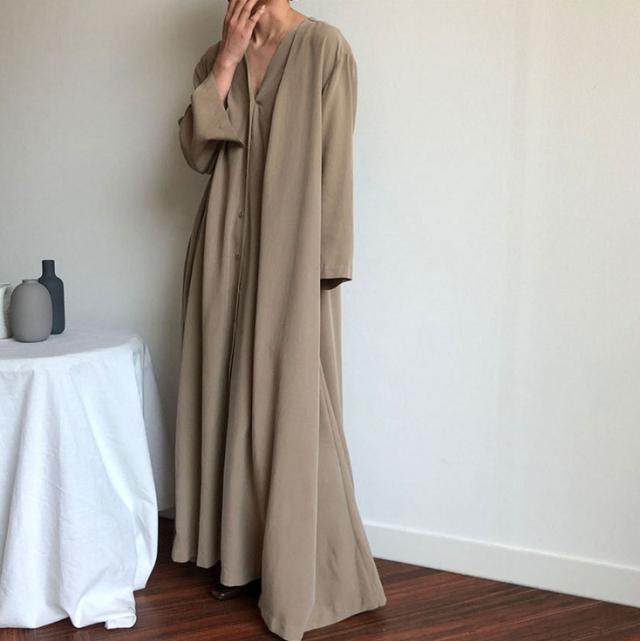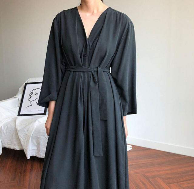 ワンピース フレアワンピース ロング丈 マキシ丈 長袖 ドロップショルダー Vネック 襟なし フレア セミフレア ワイド Aライン リボン ウエストマーク ウエストリボン 前開き ポリエステル 大人可愛い きれいめ シンプル カジュアル おしゃれ かっこいい 大人女子 こなれ感