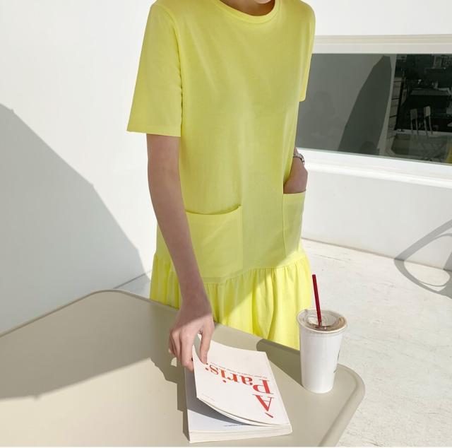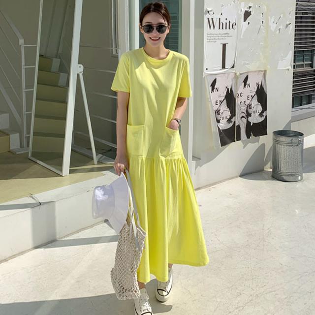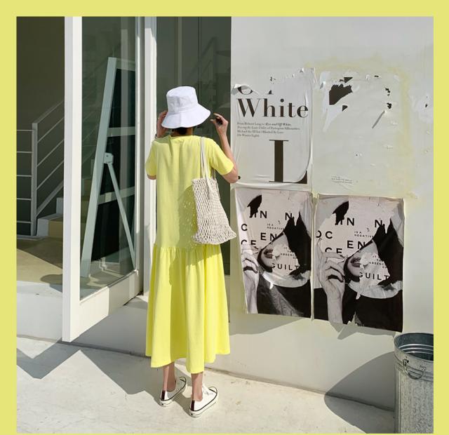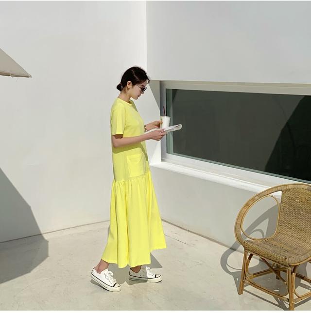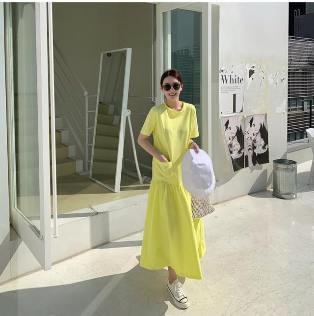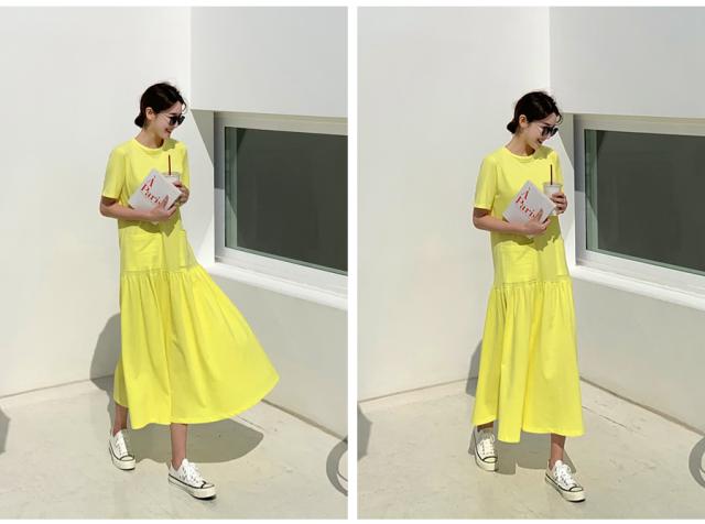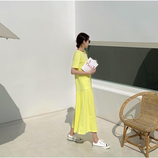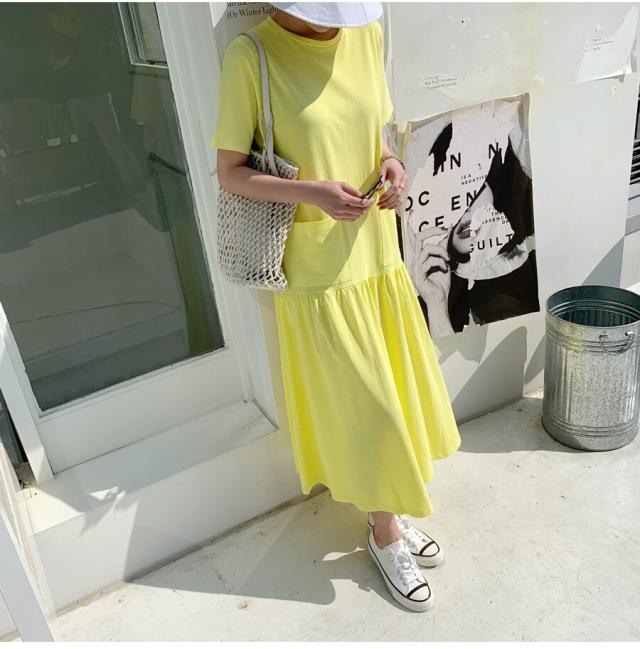 ワンピース Tシャツワンピース ミモレ丈 ロング丈 袖あり 半袖 クルーネック 襟なし フレア セミフレア ワイド 切り替えデザイン ドッキング ポケット 綿 かわいい 大人可愛い シンプル カジュアル おしゃれ お洒落 大人女子 こなれ感 ラフ ラブリー キュート ガーリー ルーズ 個性的 主役級 存在感 抜け感 無地 春 夏 10代 20代 30代 レディース 女性用 デート お出かけ 女子会 休日 リゾート 旅行 着回し 普段使い 重ね着 韓国系 オルチャン ファッション S M L XL イエロー