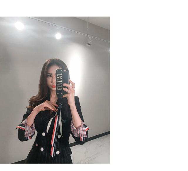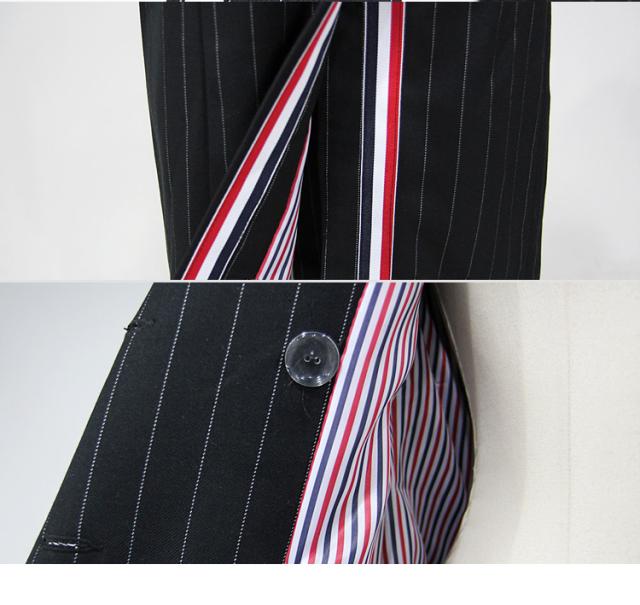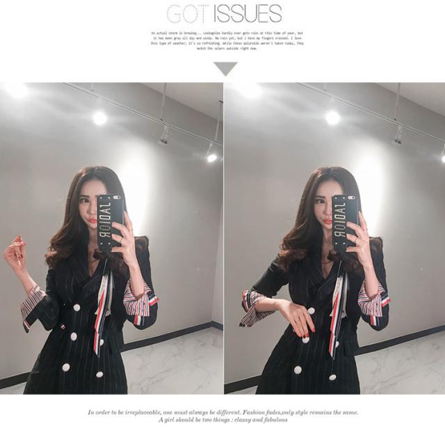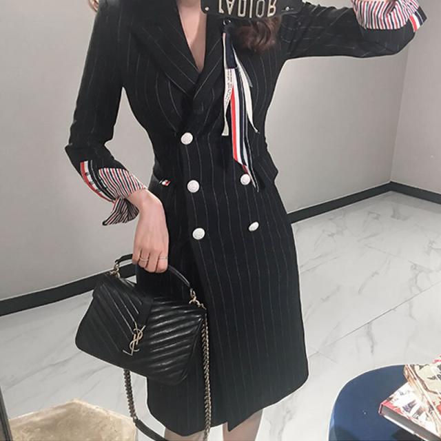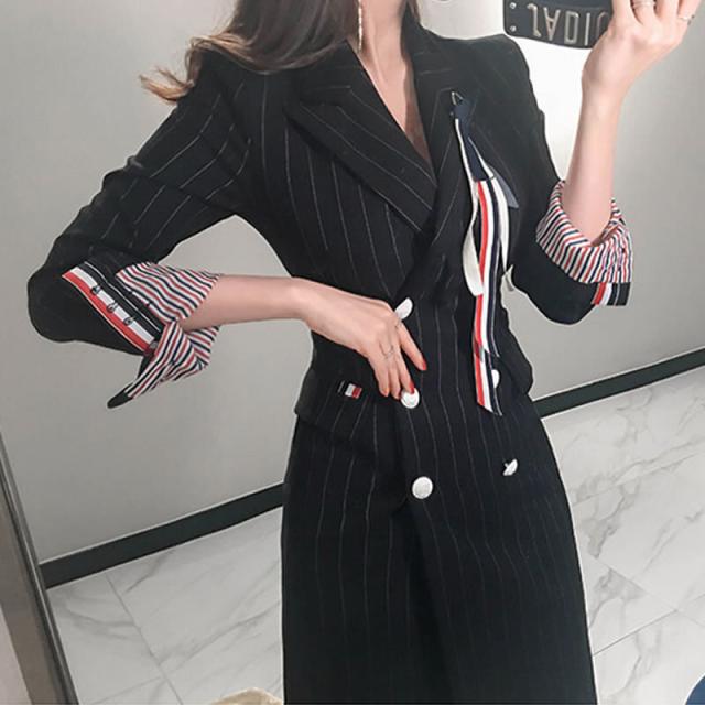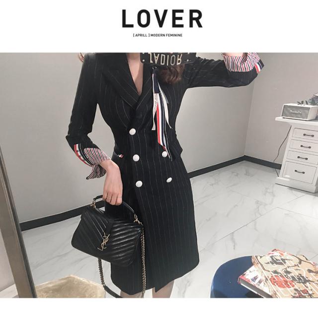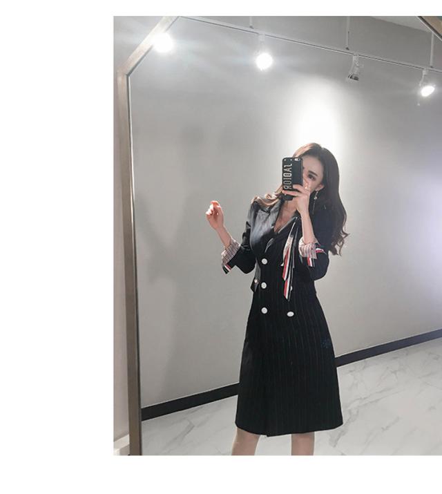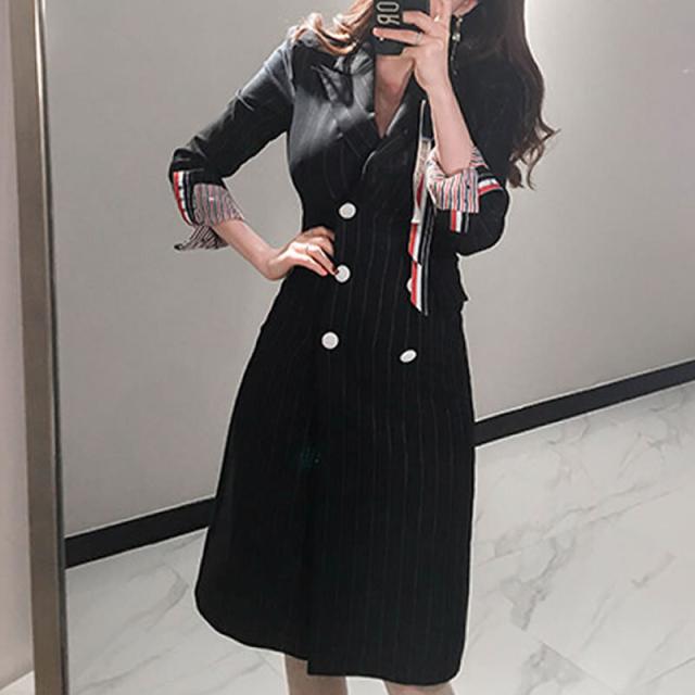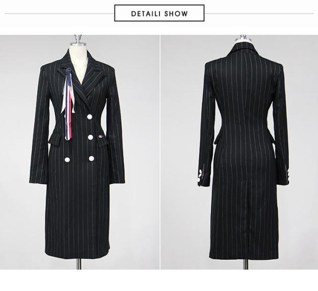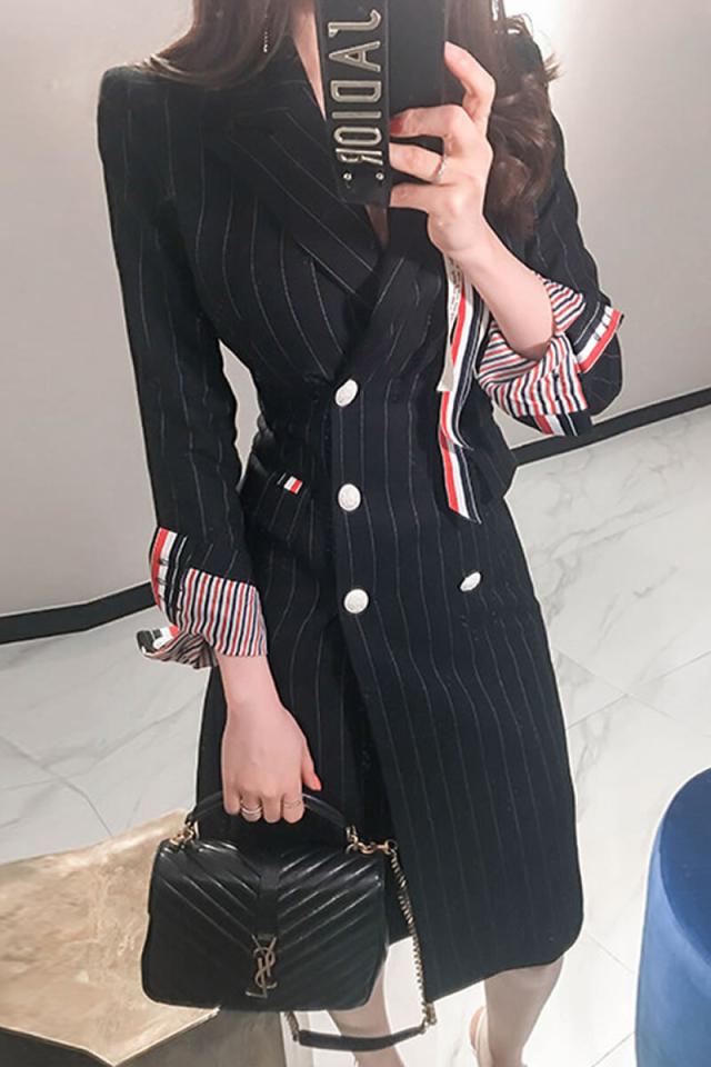 ブラックピンストライプの膝丈ジャケットワンピース。