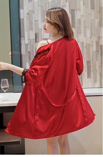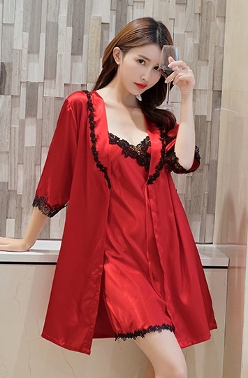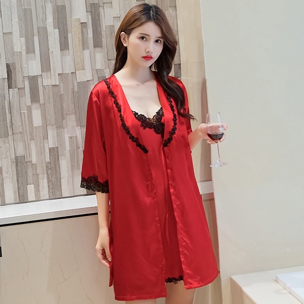 ルームウェア ネグリジェ 2点セット レディース セクシー ワンピース ガウン 羽織 カーディガン レース キャミソール スリット 春 夏 秋 リボン 韓国 トレンド 流行 ベージュ アプリコット 赤 レッド 黒 ブラック 半袖 五分袖 膝上 ミニ丈 ショート丈 デコルテ リラックス
