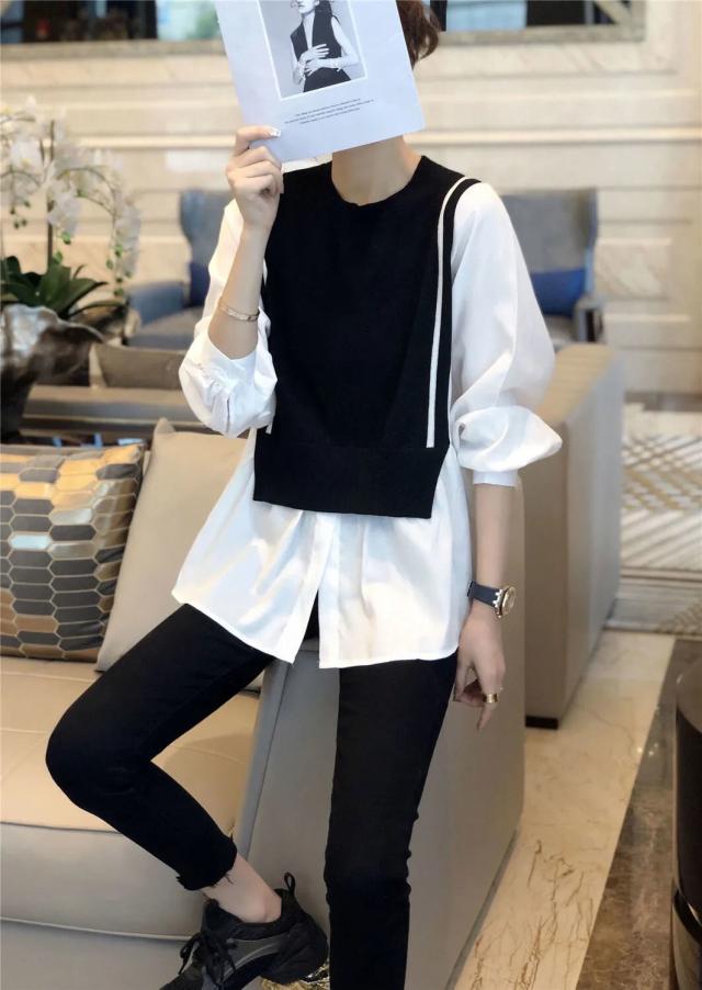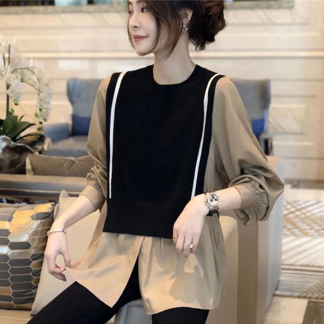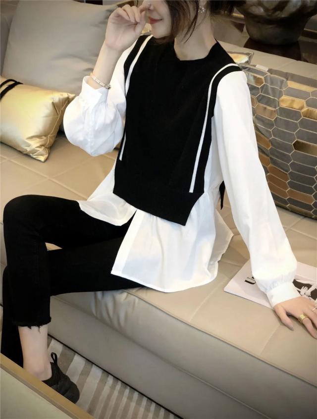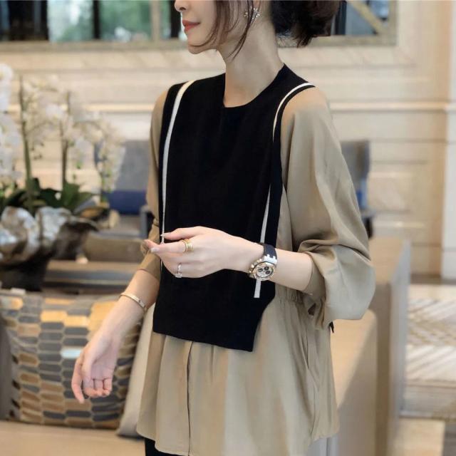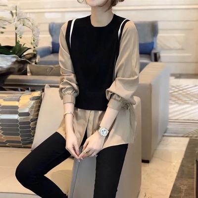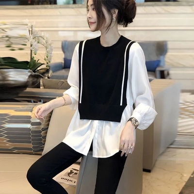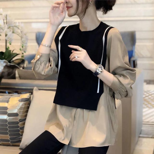 トップス ブラウス 切り替え ドッキング レディース 長袖 大きいサイズ 大きめ ゆったり L XL 2XL 3XL 重ね着 ラウンドネック ベスト ニット お洒落 オシャレ カジュアル こなれ感 春 秋 ウエスト くびれ 着痩せ 細見え 体型カバー かわいい 大人可愛い きれいめ 上品 レトロ