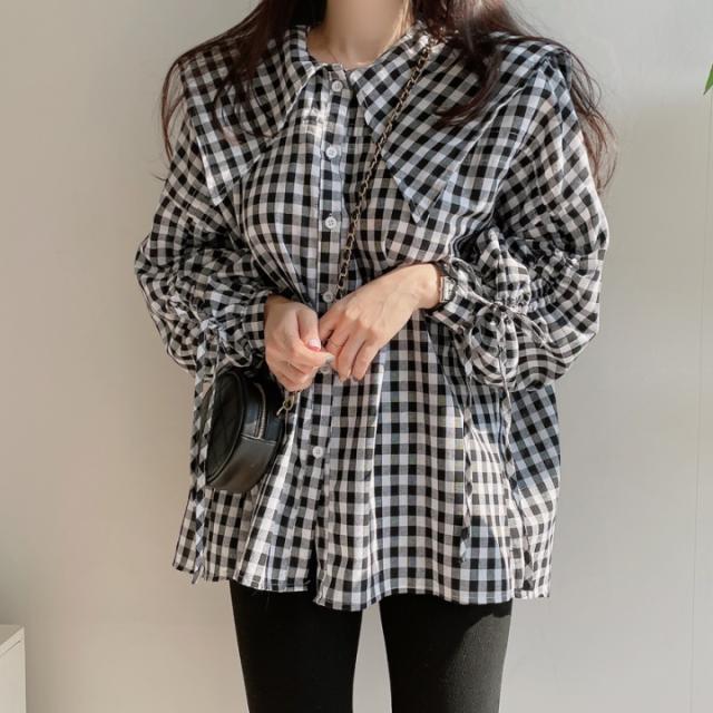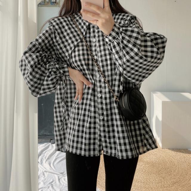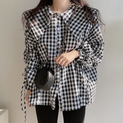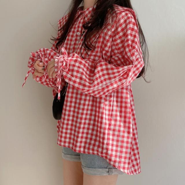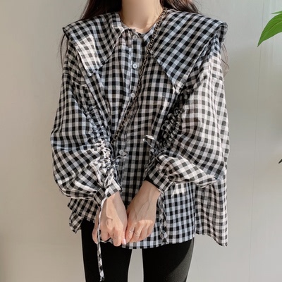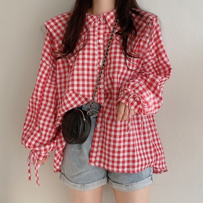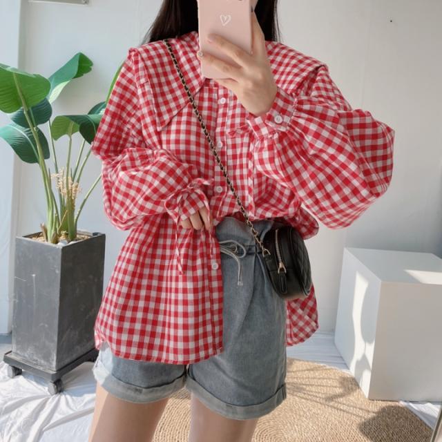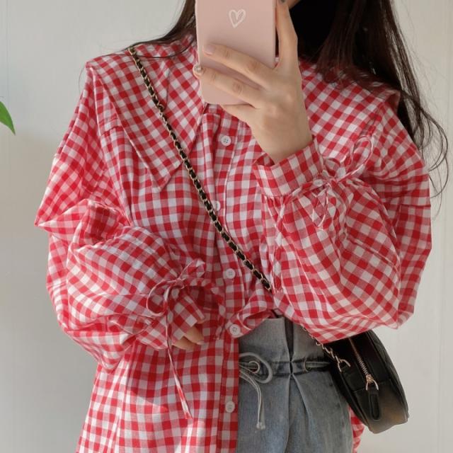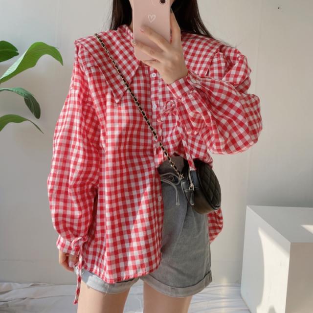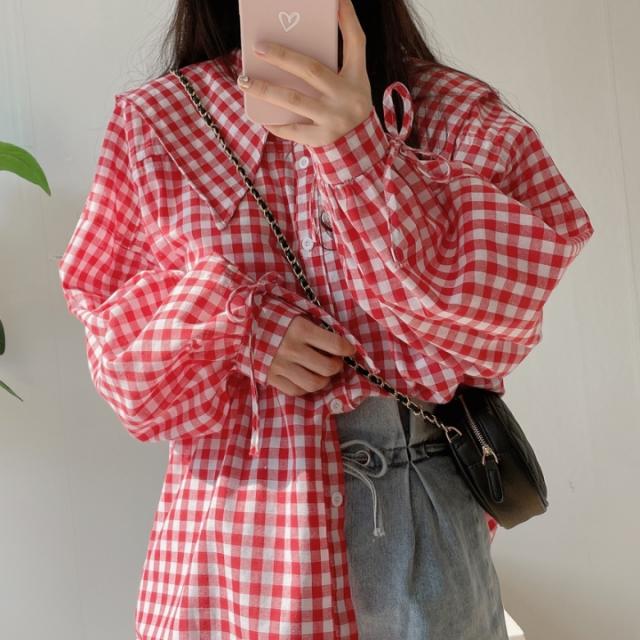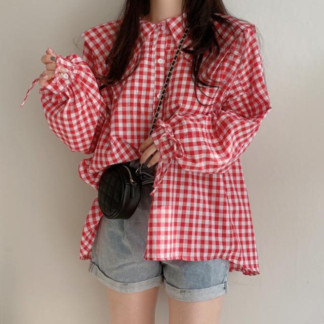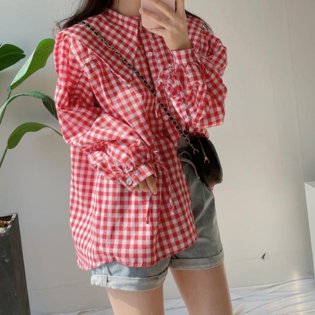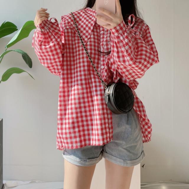 トップス ブラウス ビッグカラー ギンガムチェック 長袖 レディース カットソー 上品 清楚 高級感 きれいめ かわいい 大人可愛い ガーリー フェミニン カジュアル お洒落 オシャレ ゆったり 体型カバー 着痩せ 赤 黒 レッド ブラック 総柄 韓国 トレンド 流行 春 夏 秋 レトロ