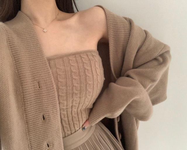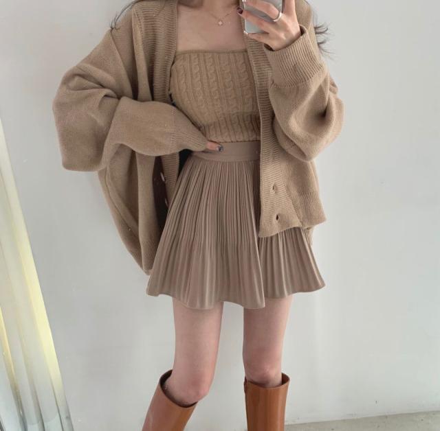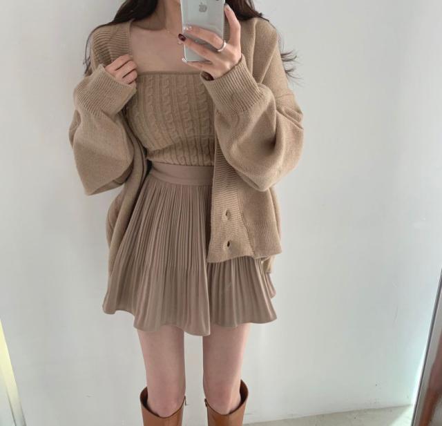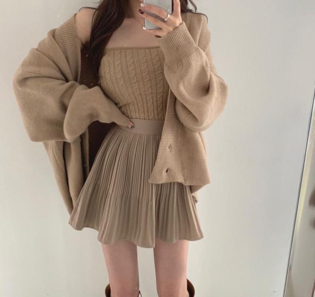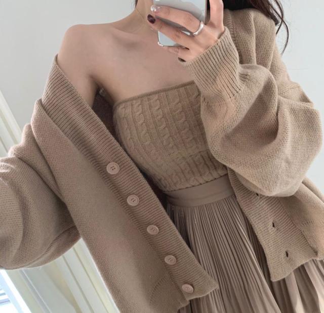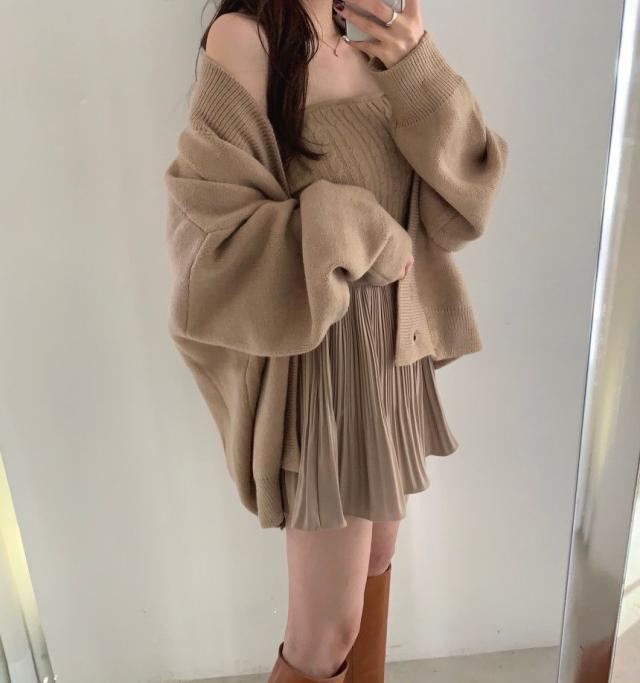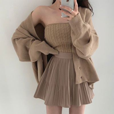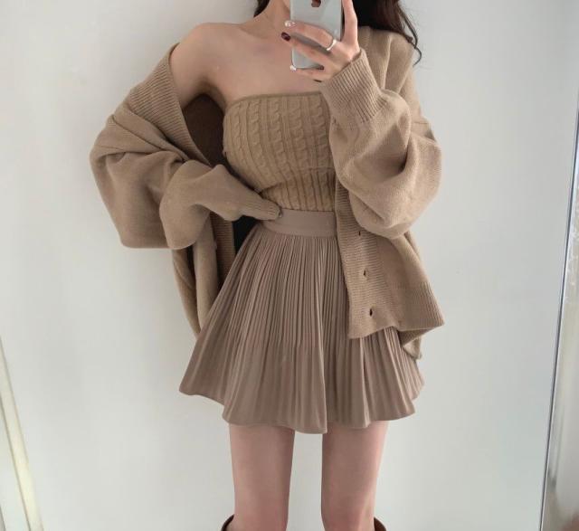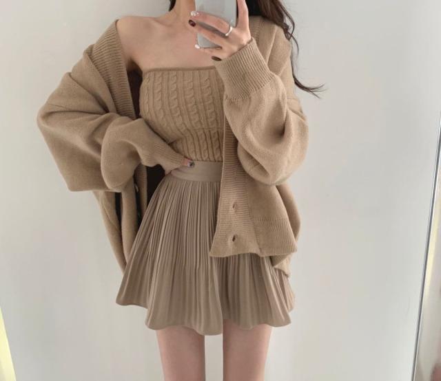 3点セット ニット カーディガン スカート チューブトップ レディース トップス ゆったり 大きめ 羽織 オーバーサイズ 長袖 ニットカーディガン ベアトップ ブラトップ キャミソール インナー タイト スリム セクシー 色っぽ ハイウエスト Aライン プリーツ ミニ丈 ミニスカート ショート丈 無地 ブラウン かわいい 大人可愛い 春 秋 お得 お買い得 楽ちん ラフ 女子会 デート オシャレ お洒落 エレガント 着回し ガーリー お出かけ 買い物 10代 20代 30代 きれいめ エレガント 大人女子