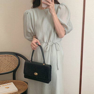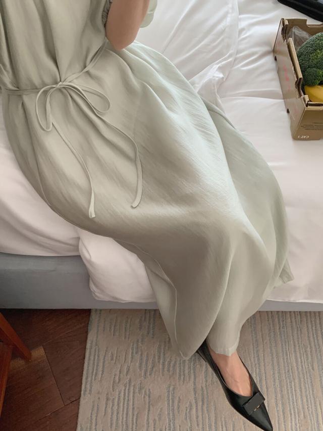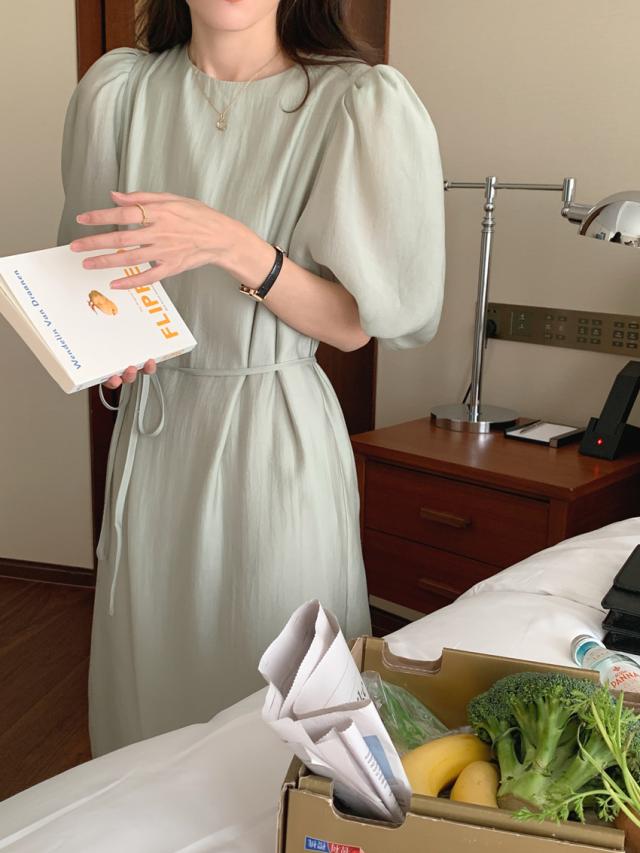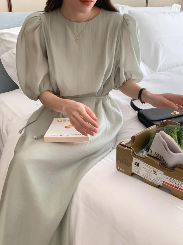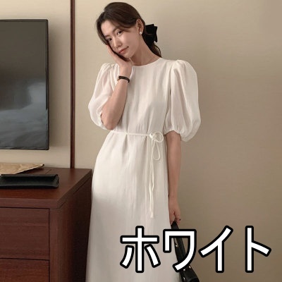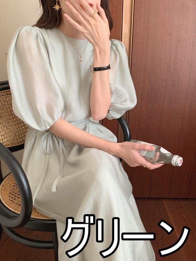 ワンピース ドレス 4色 パフスリーブ バックスリット レディース バックデザイン 透け感 シフォン 柔らか Aライン 膝下 膝丈 ロング丈 ふんわり ボリューム パステルカラー 背中見せ リボン ウエストくびれ 体型カバー 着痩せ きれいめ 上品 清楚 かわいい 大人可愛い フェミニン お洒落 オシャレ 普段着 普段使い お呼ばれ パーティー エレガント こなれ感 緑 グリーン ホワイト 白 ブルー 青 水色 ベージュ 無地 女子会 デート モテ 映え SNS