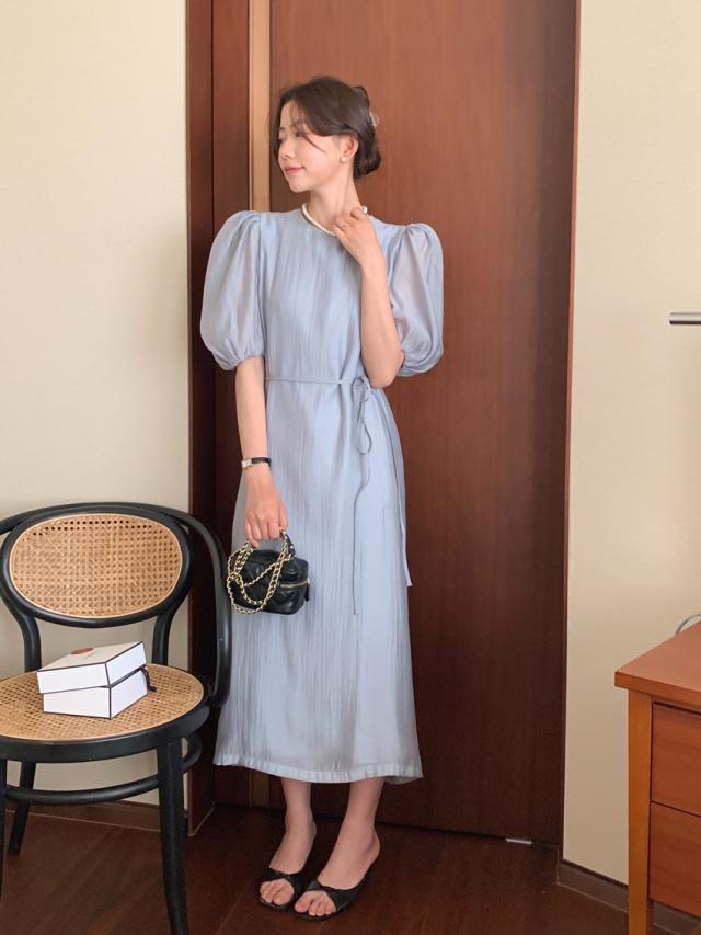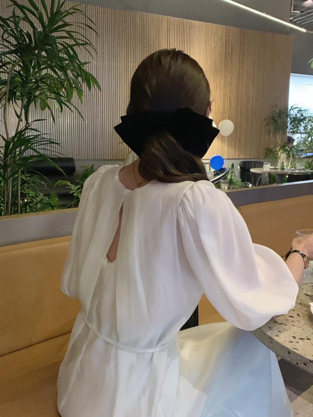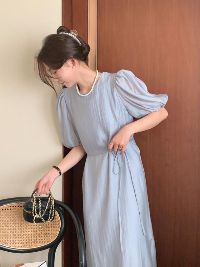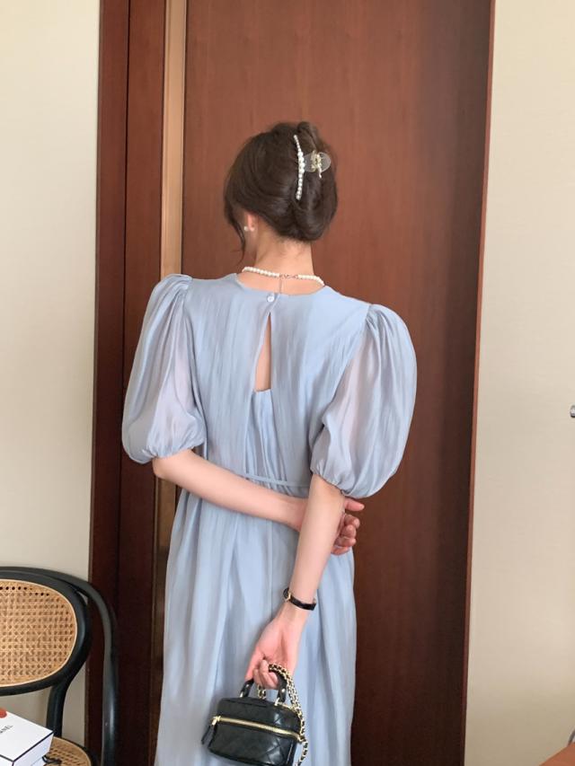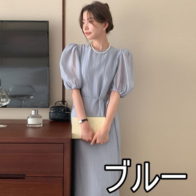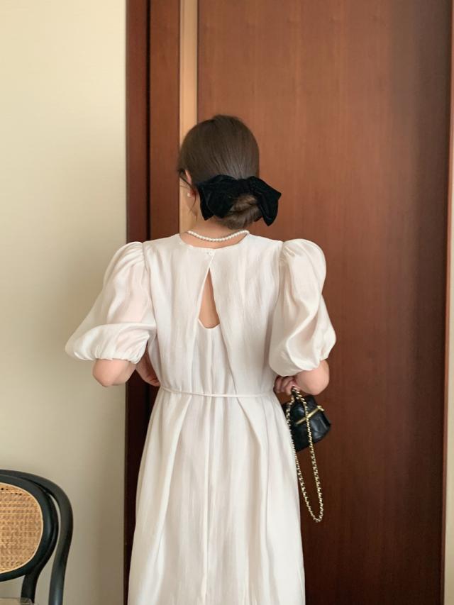 ワンピース ドレス 4色 パフスリーブ バックスリット レディース バックデザイン 透け感 シフォン 柔らか Aライン 膝下 膝丈 ロング丈 ふんわり ボリューム パステルカラー 背中見せ リボン ウエストくびれ 体型カバー 着痩せ きれいめ 上品 清楚 かわいい 大人可愛い
