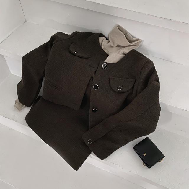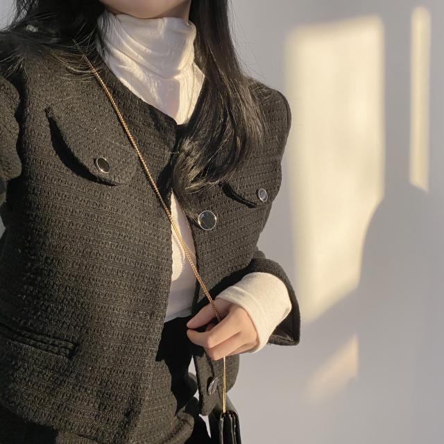 ツイードジャケットとスカートのセットアップです。