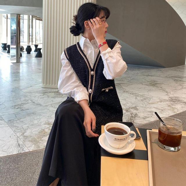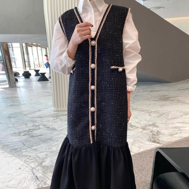 セットアップ レディース ジャンパースカート ジャンスカ ロングワンピース ツイードワンピース 長袖白シャツ Vネック 裾フレア パールボタン 切り替えデザイン ドッキング 2点セット かわいい 大人可愛い きれいめ 大人 上品 おしゃれ お洒落 大人女子 ラブリー 個性的 存在感 ワンサイズ フリーサイズ 黒 ブラック 白 ホワイト 春 秋 冬 10代 20代 30代 40代 通勤 学生 通学 デート お出かけ 女子会 休日 旅行 モテ プレゼント ギフト 着回し 普段使い 重ね着 お揃い 双子