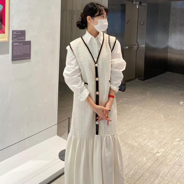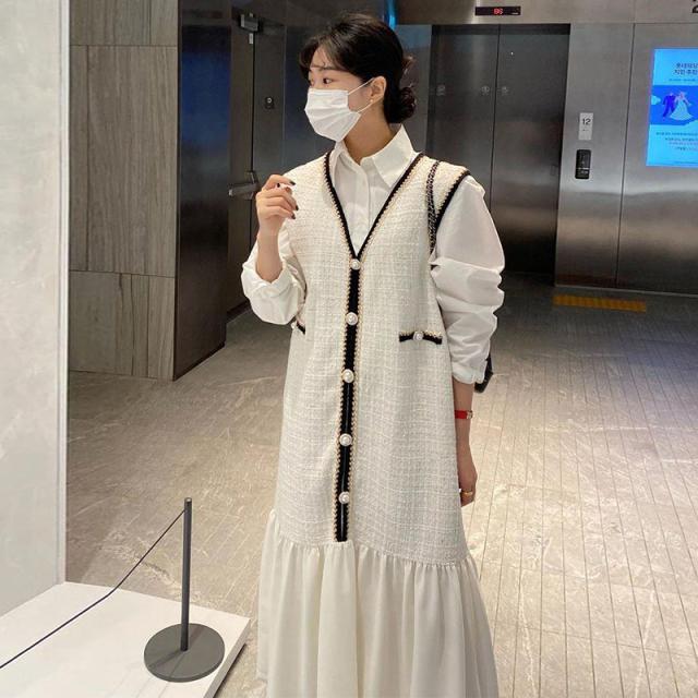 2色カラバリ、長袖白シャツとVネック袖なしロングワンピースのセットアップ。