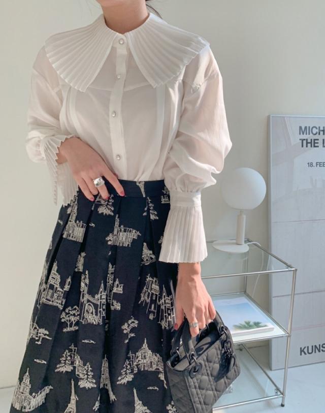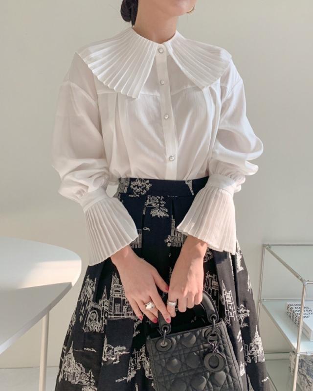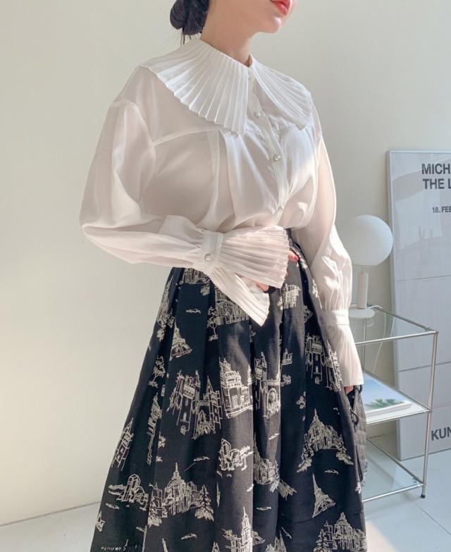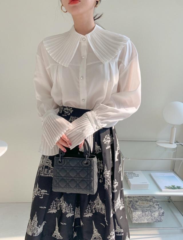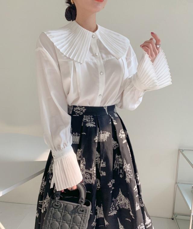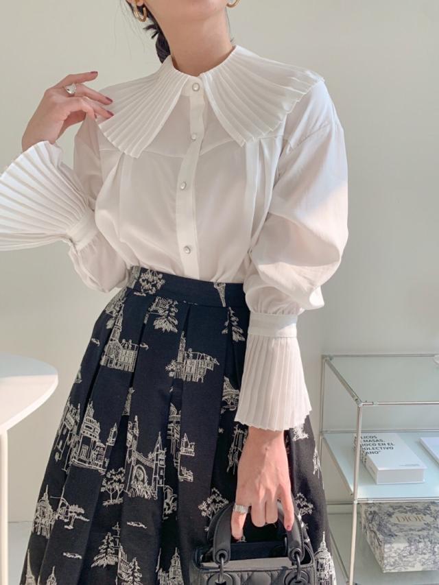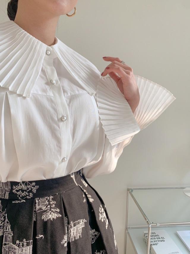 プリーツの襟と袖が素敵なシャツ。
