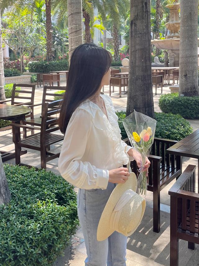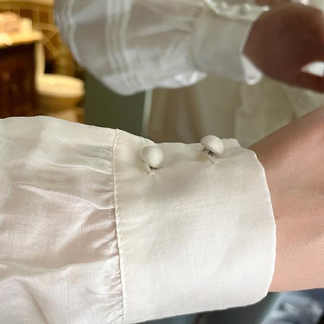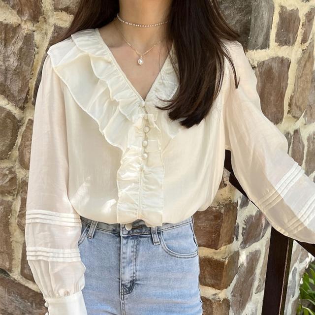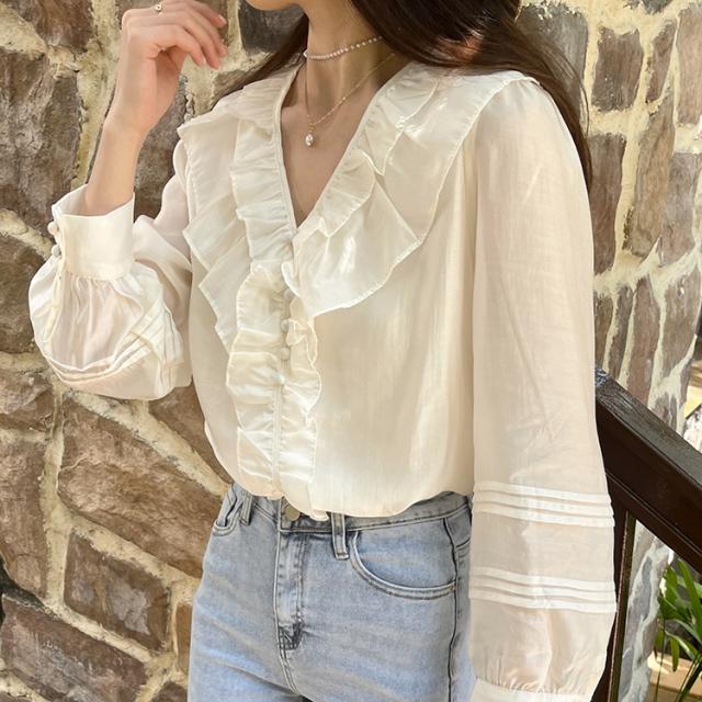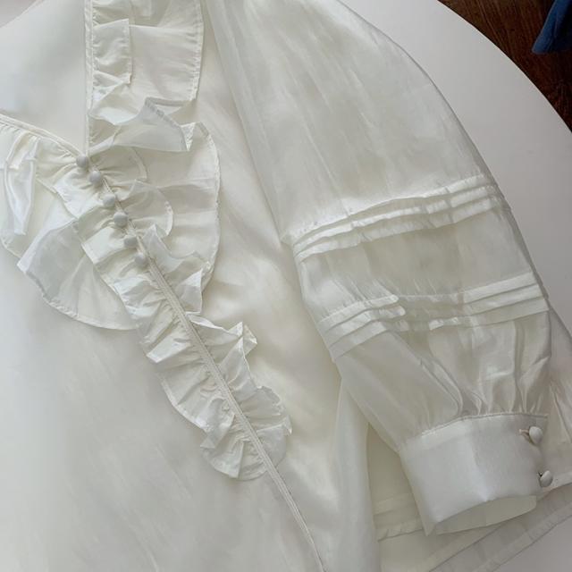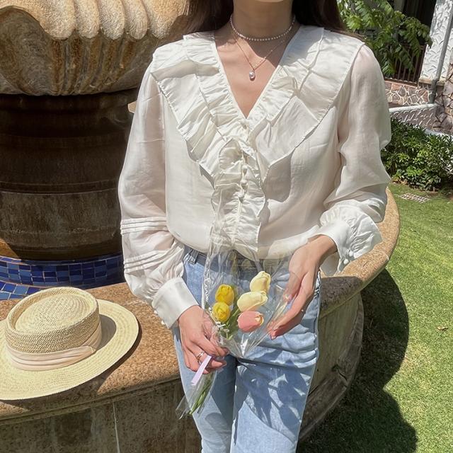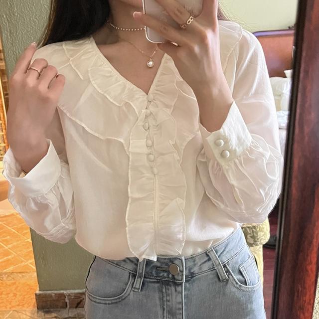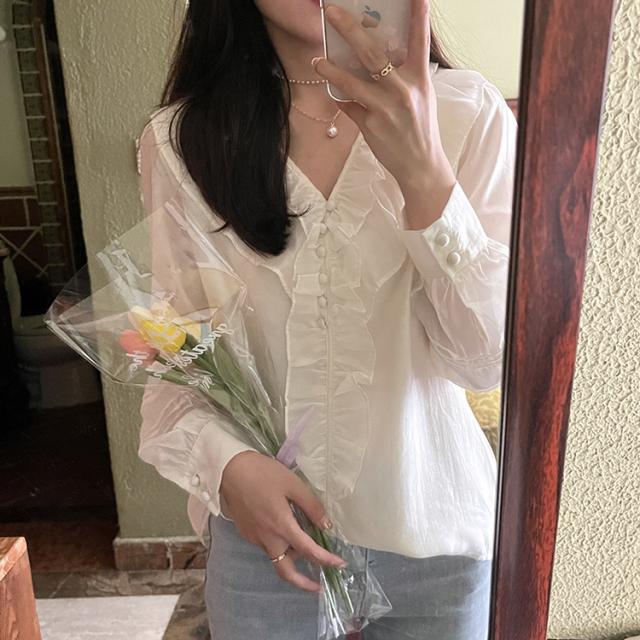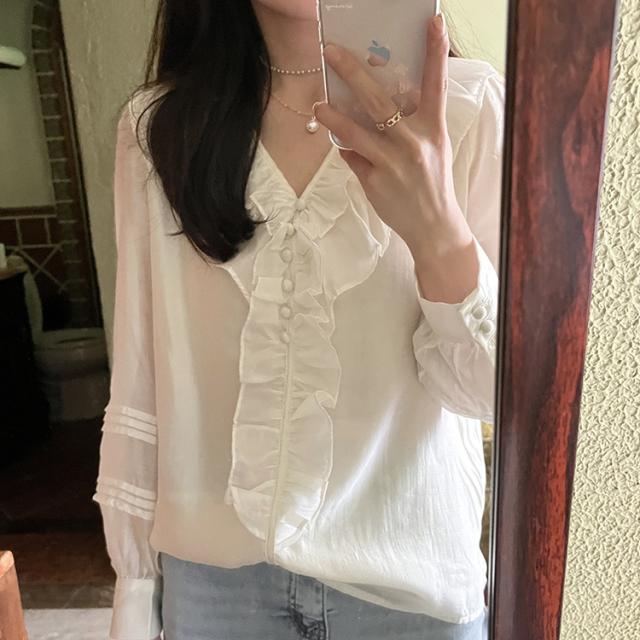 トップス ブラウス 長袖 Vネック レディース シャツ フリル シフォン 透け感 フリル襟 エレガント 上品 清楚 高級感 きれいめ かわいい 大人可愛い ガーリー フェミニン カジュアル お洒落 オシャレ ゆったり 大きめ S М L 体型カバー 着痩せ 白 ホワイト 無地 韓国 トレンド 流行 春 夏 秋 量産型 姫系 ロリータ レトロ ヴィンテージ アンティーク 20代 30代 40代 着回し 重ね着 デート 女子会 モテ 映え SNS インスタ ボタン 鎖骨 デコルテ とろみ 抜け感 こなれ感