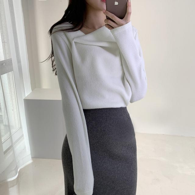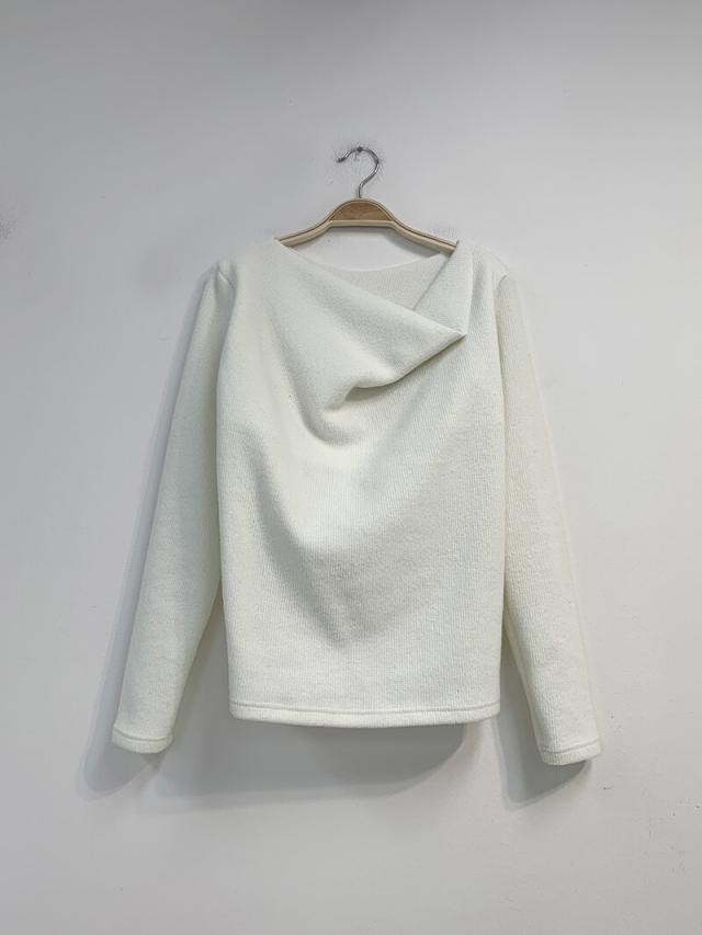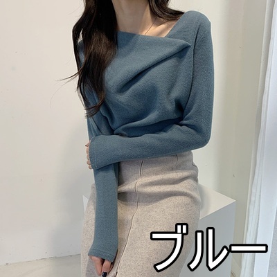 トップス ニットソー 3色 長袖 レディース ニット カットソー くすみカラー アシンメトリー 薄手 春 秋 冬 タイト スリム 細身 ホワイト 白 青 ブルー ベージュ グレー 無地 シンプル カジュアル きれいめ 上品 エレガント オシャレ お洒落 かわいい 大人可愛い 高級感 セーター 斜め デザイン タック こなれ感 着回し 20代 30代 40代 50代 ゆったり 体型カバー ボリューム 鎖骨 デコルテ 華奢 抜け感 シック モード 個性派 個性的 とろみ 体型カバー 映え SNS 休日 買い物